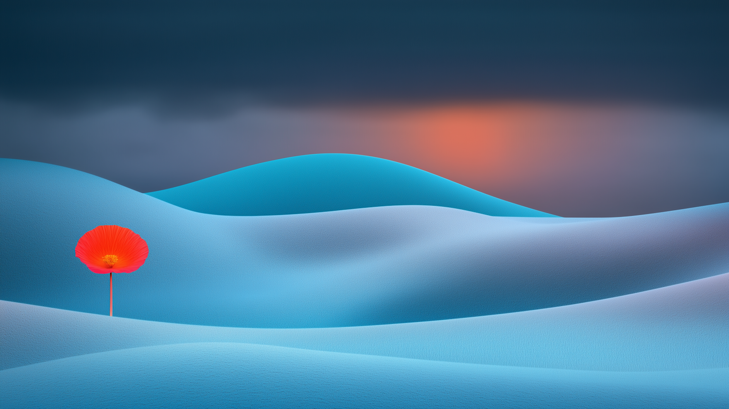 A striking red flower against smooth blue hills under a moody sky with orange light. Minimalist and surreal landscape.