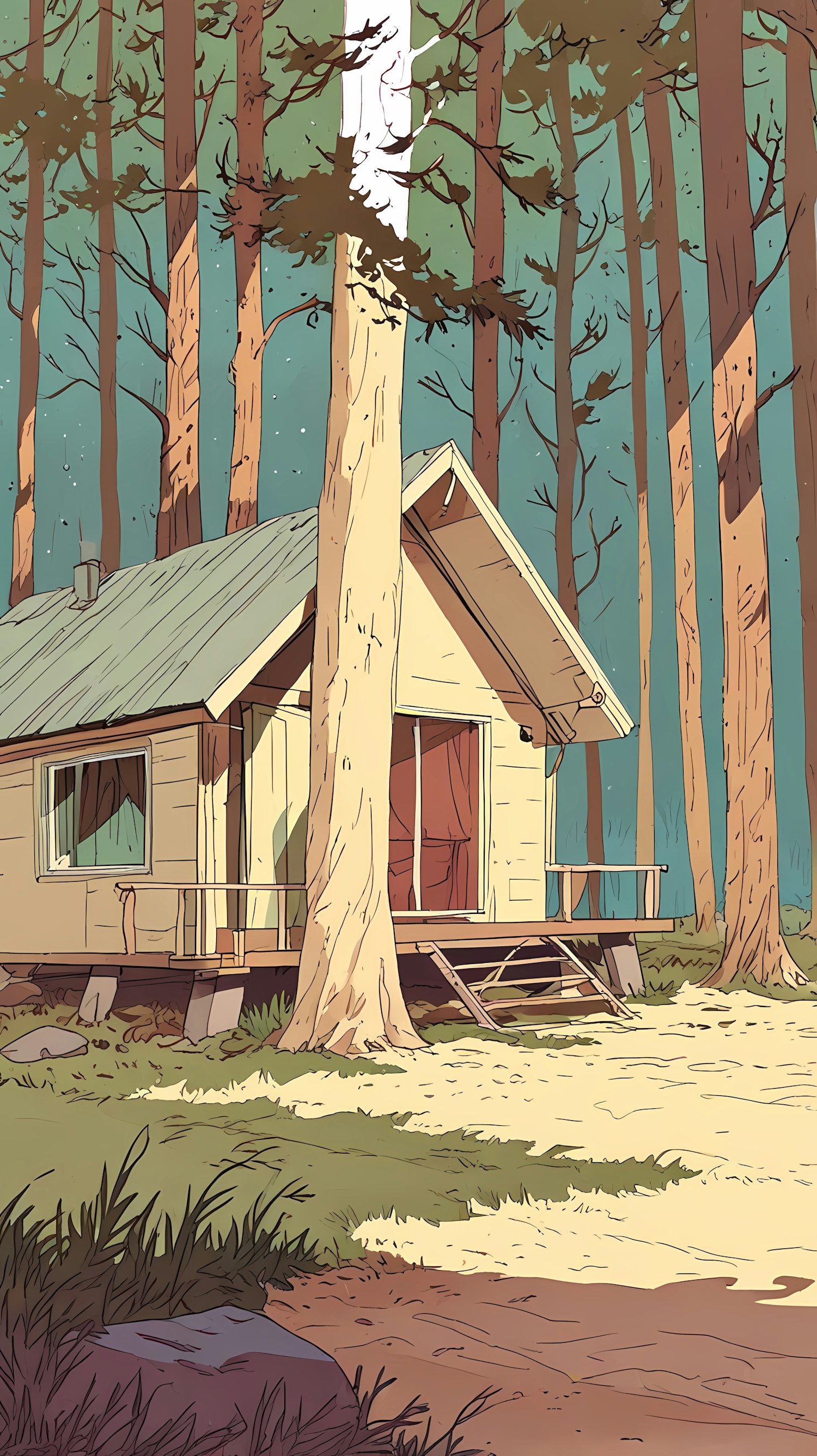 A charming wooden cabin surrounded by tall trees, nestled in the woods with filtered sunlight creating a serene environment.