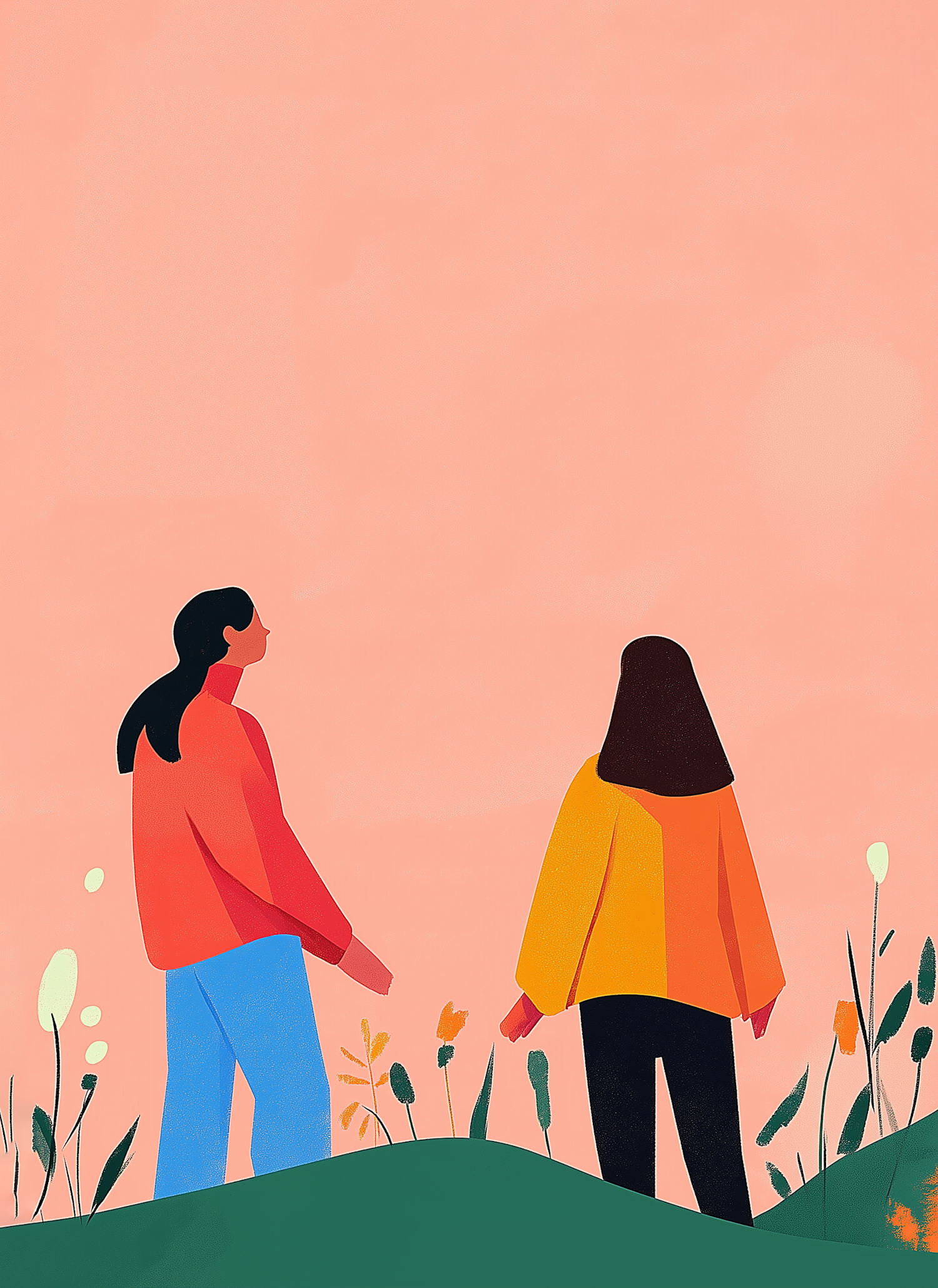 Two stylized figures stand on a hill with abstract plants, set against a warm peach background. Modern and minimalistic illustration.