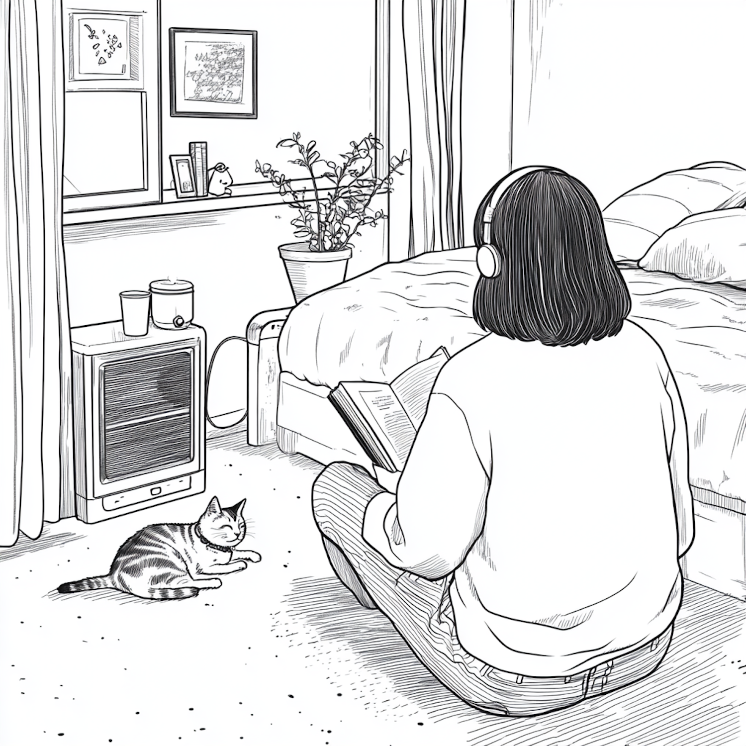 Illustration of a cozy room with a person reading and a cat lounging, creating a peaceful and inviting atmosphere.