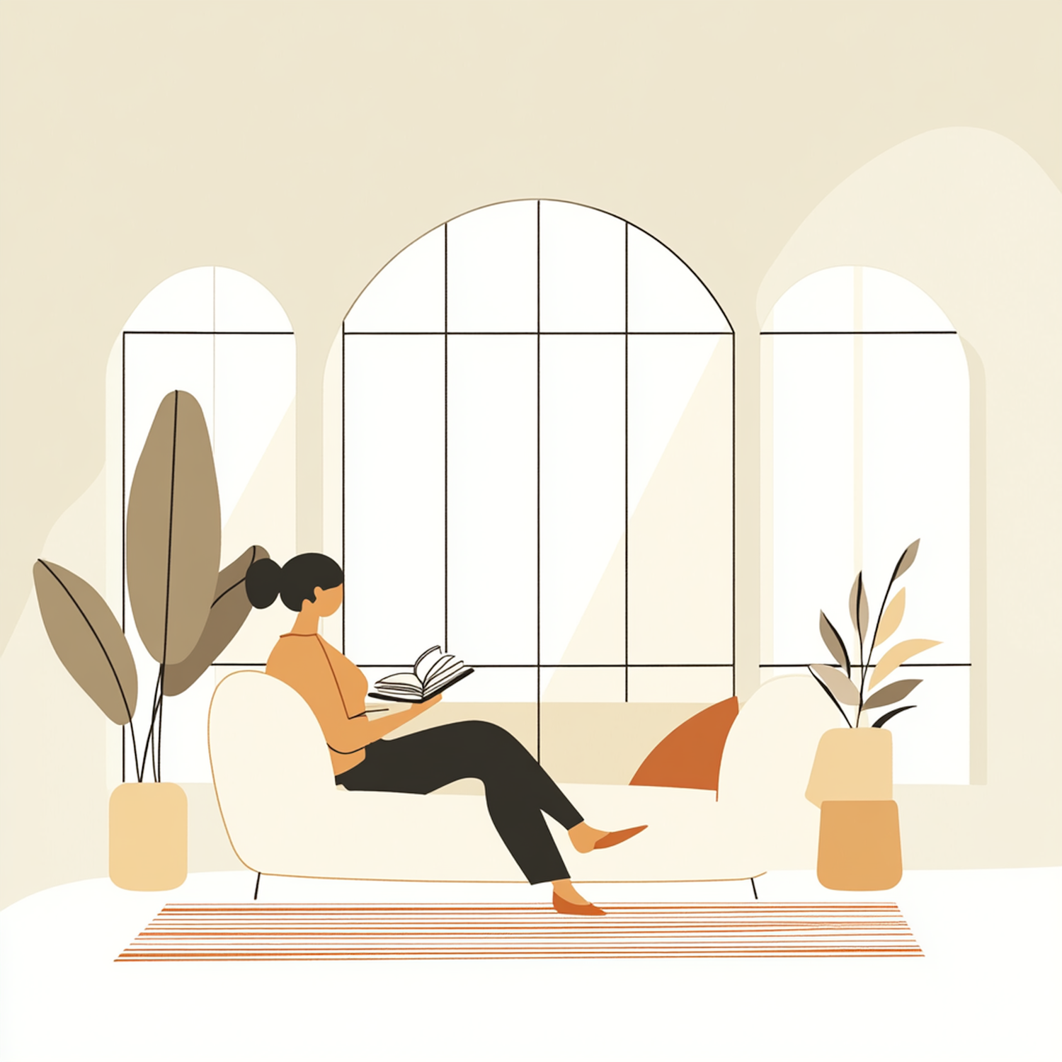 Minimalist illustration of a woman reading on a sofa, surrounded by plants and large windows, in warm, neutral tones.