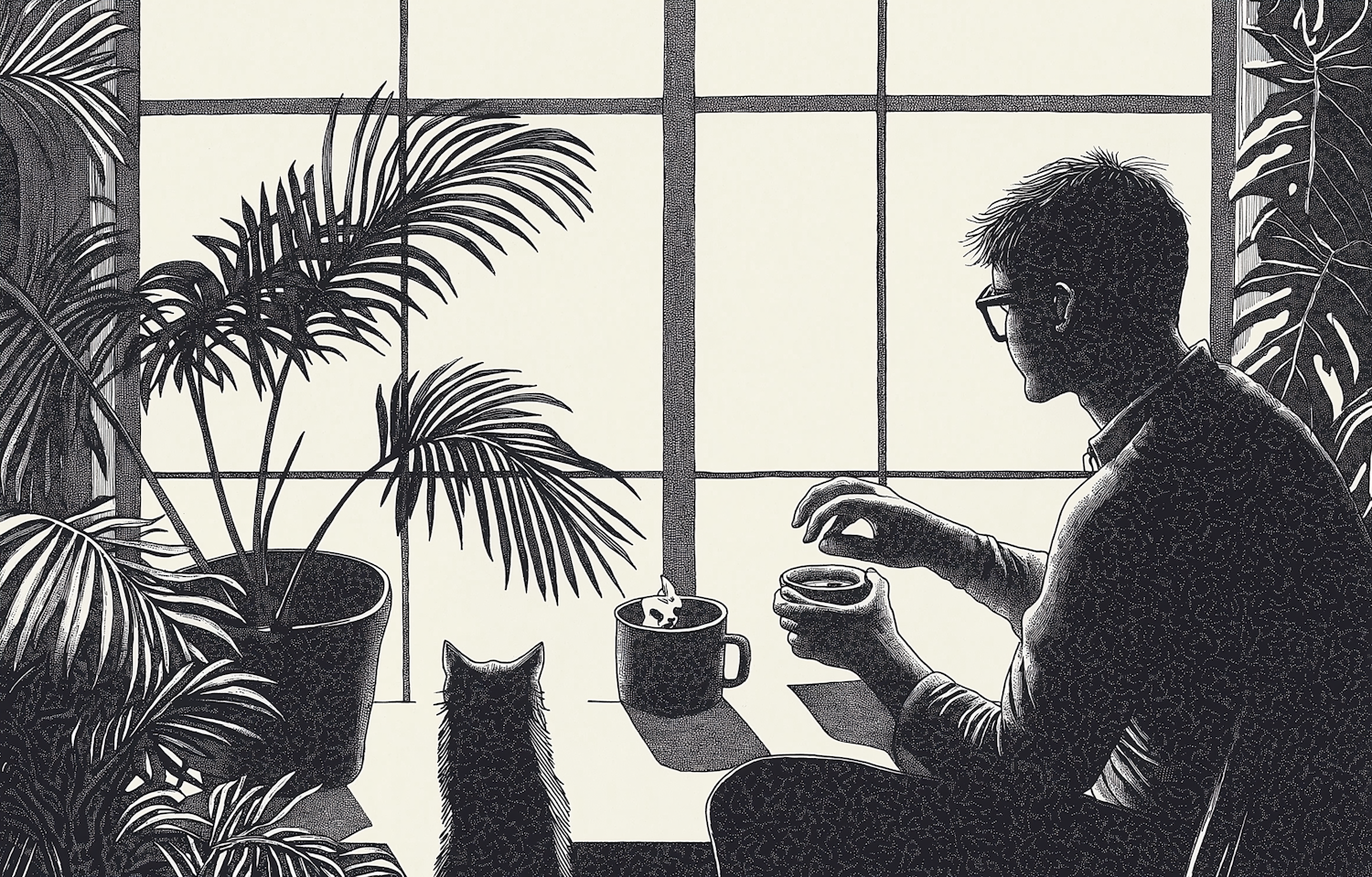 Monochrome illustration of a man with coffee and a cat by a window, surrounded by plants. Calm and introspective atmosphere.