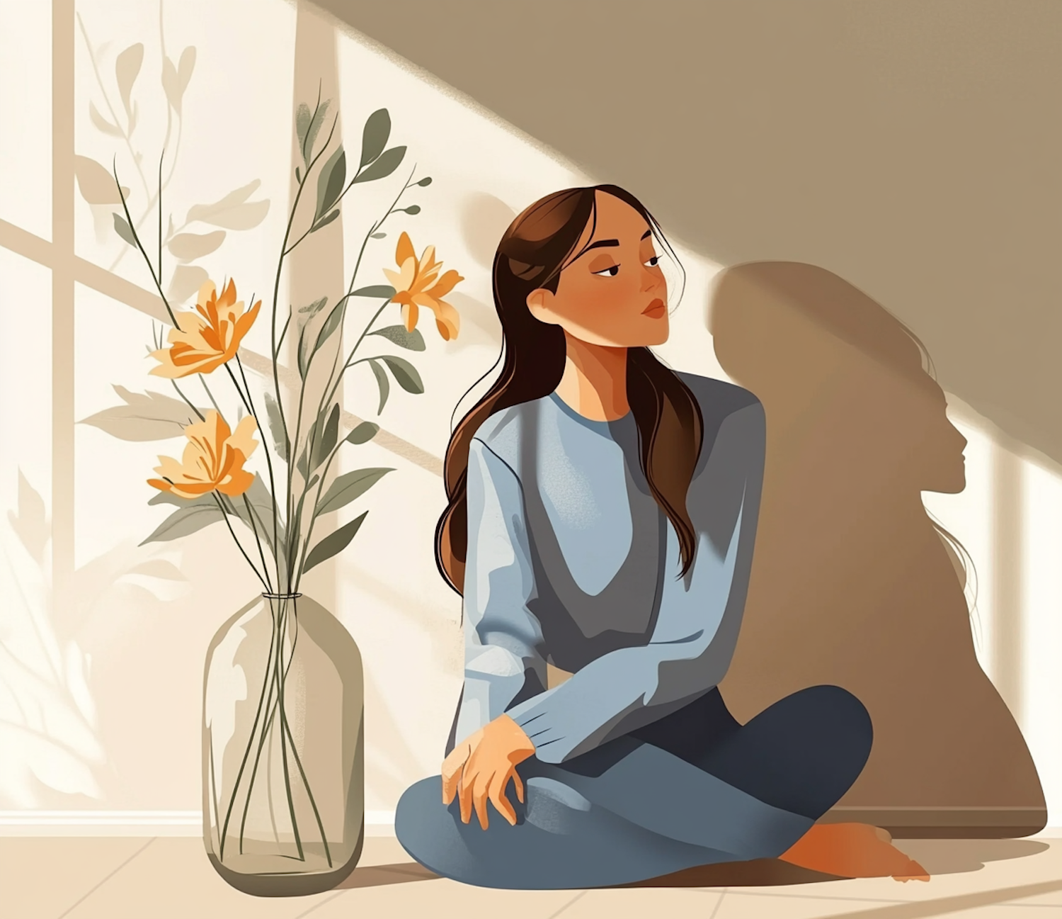 Illustration of a woman sitting by a window with a vase of orange flowers, bathed in warm sunlight.