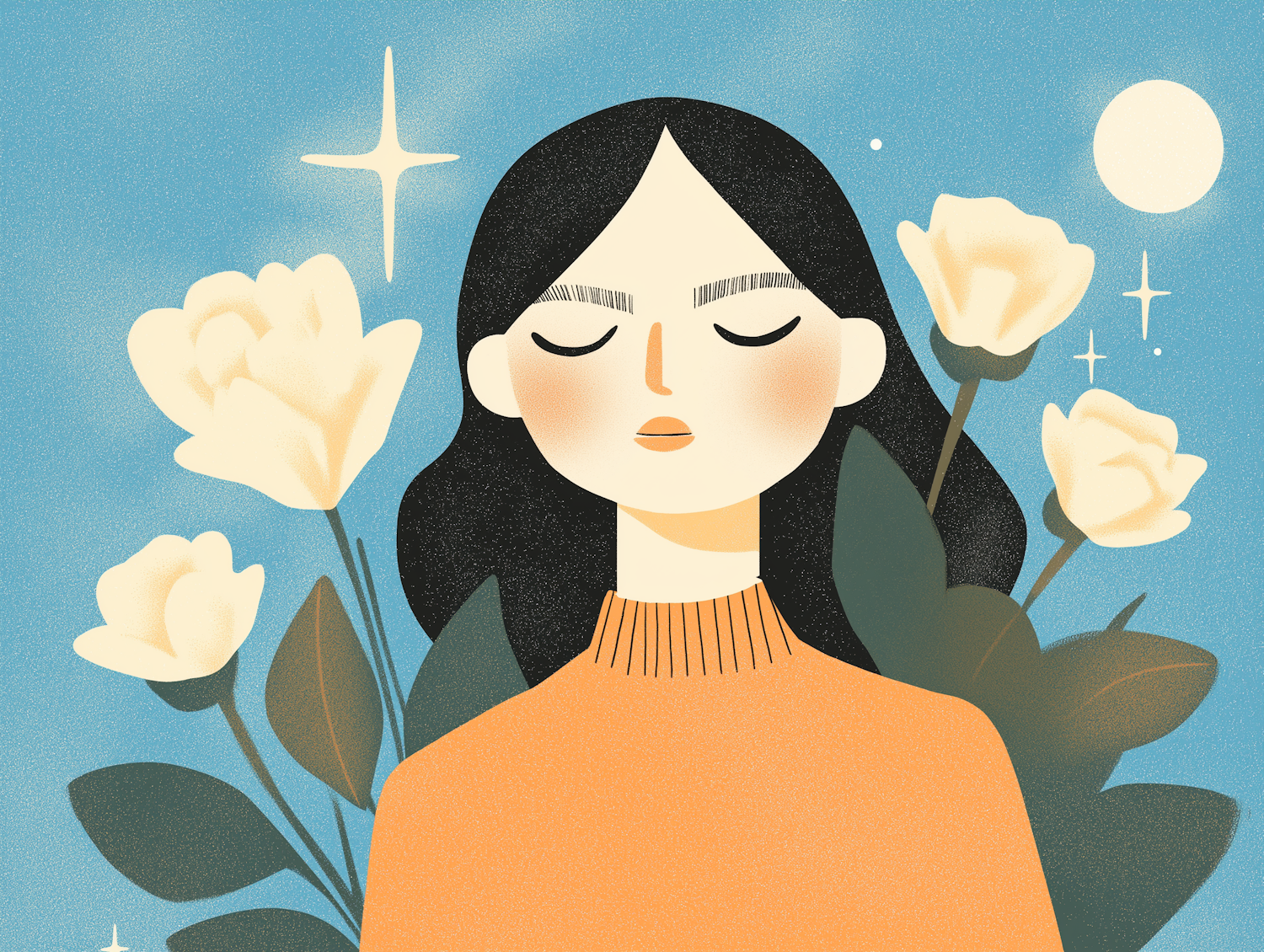 Serene illustration of a person with closed eyes, surrounded by flowers and stars, set against a dreamy blue background.