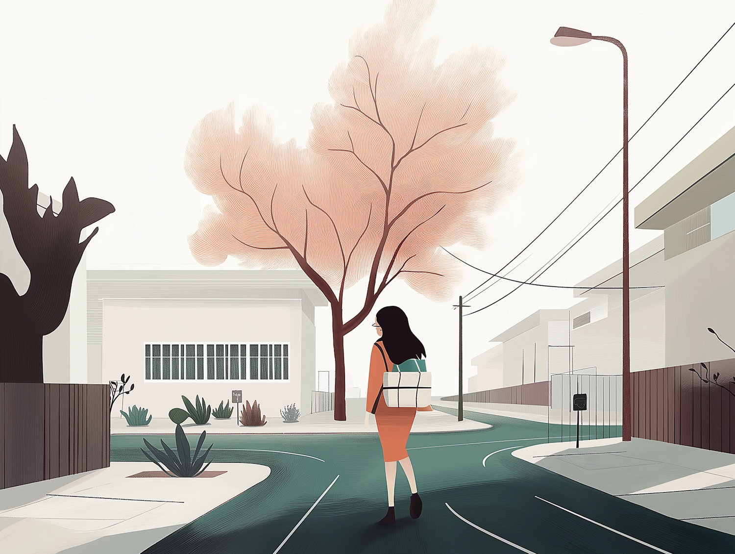 Stylized illustration of a woman walking on a suburban street with modern buildings and a pink tree, creating a serene atmosphere.
