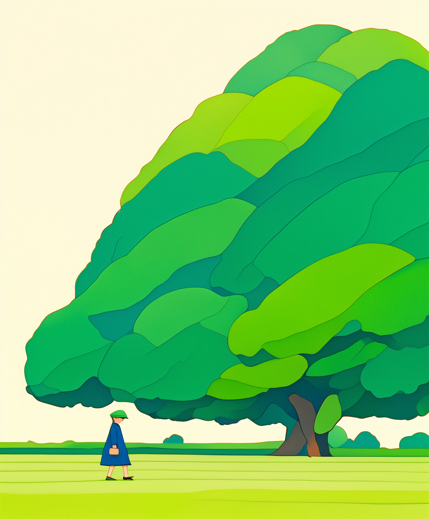 Stylized illustration of a large green tree with a small figure in a blue coat walking beneath it, set against a pale yellow background.