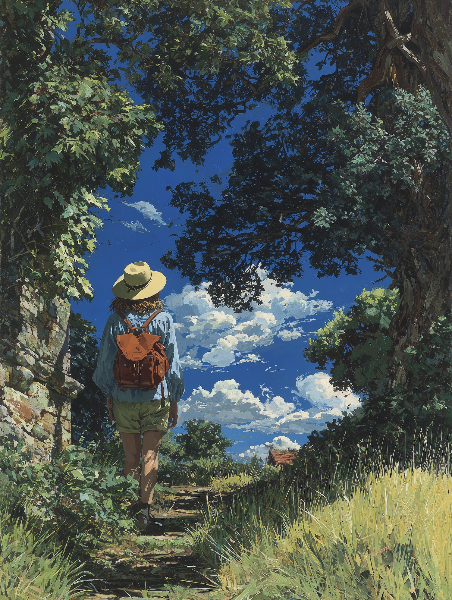 A serene outdoor scene of a person walking on a path under a vibrant blue sky, surrounded by lush greenery and natural beauty.