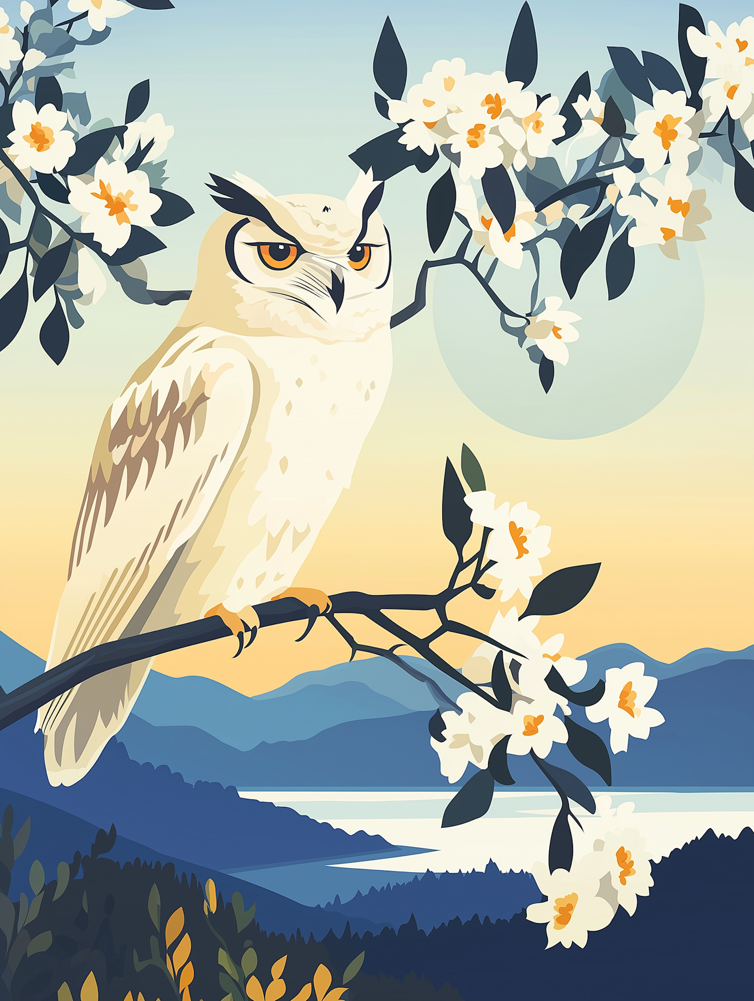 Stylized owl illustration with white flowers, blue hills, and a pastel sky, capturing elegance and tranquility.