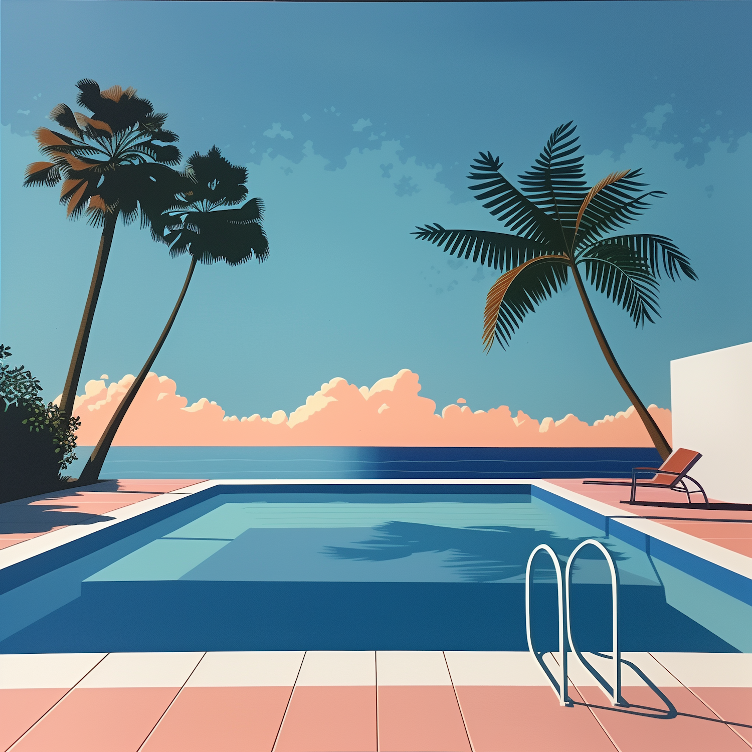 Stylized poolside scene with palm trees, blue sky, and pink-tiled deck. Inviting lounge chair adds a touch of relaxation.