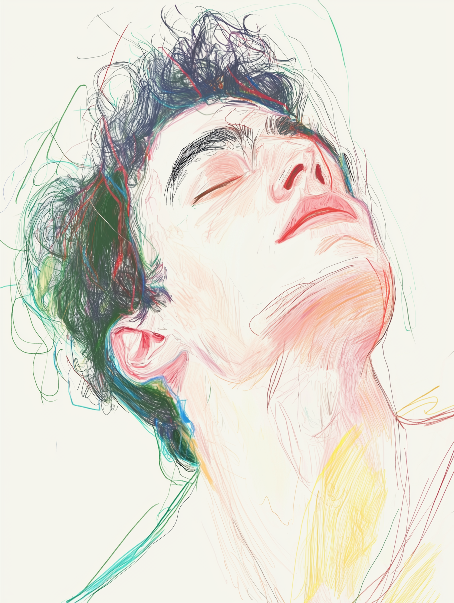 Expressive illustration of a serene person with colorful hair and closed eyes, capturing a moment of relaxation and introspection.