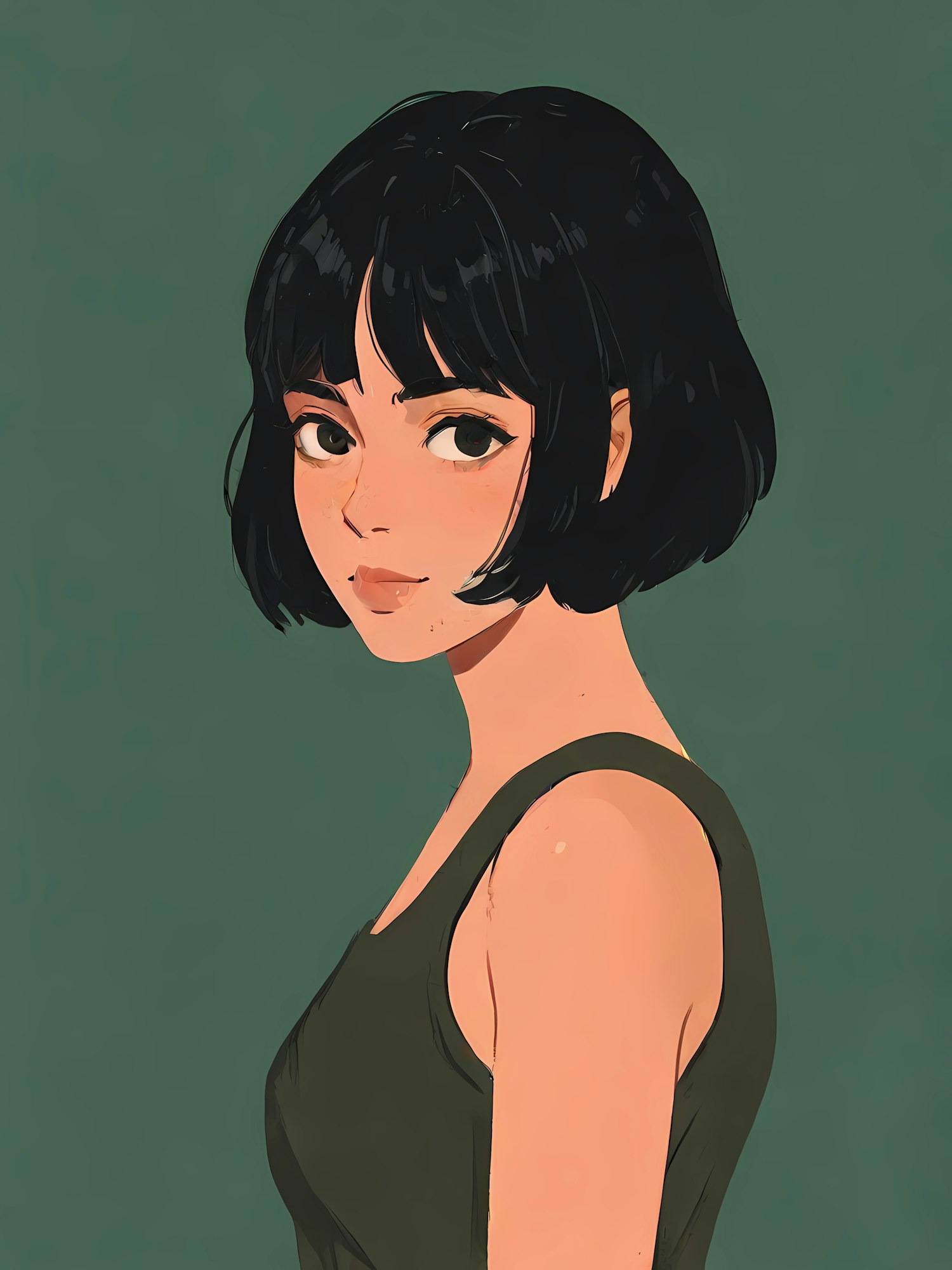 Digital illustration of a woman with short black hair and a green top against a muted green background.