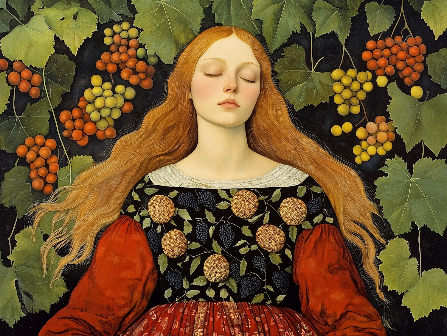 A tranquil illustration of a woman with auburn hair in a fruit-patterned dress, surrounded by vibrant grapevines and clusters of grapes.