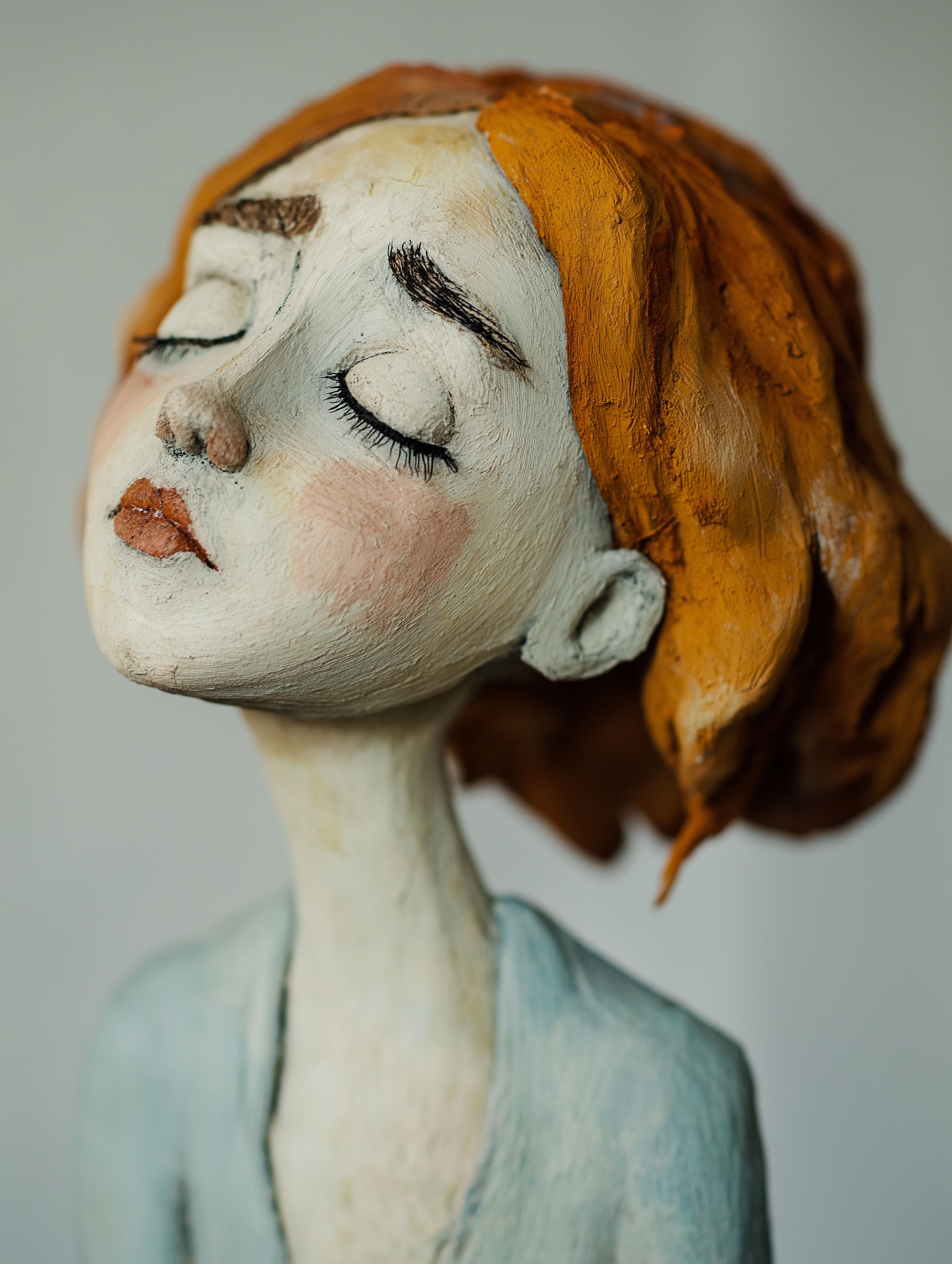 Clay sculpture of a serene woman with closed eyes, orange hair, and a light blue garment. Handcrafted artistic texture.