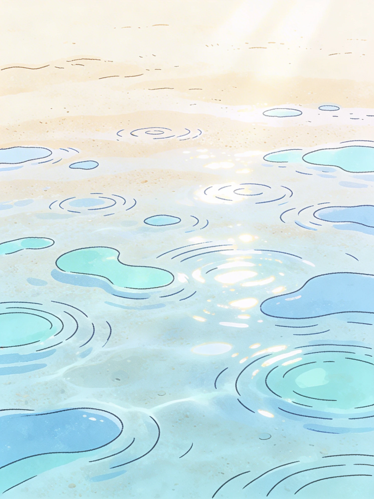 A serene illustration of shallow water with ripples and light reflections near a sandy shore, evoking a peaceful coastal vibe.