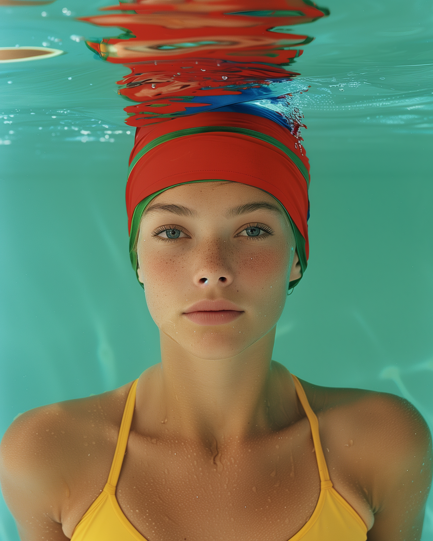 Young woman underwater in a red swim cap and yellow swimsuit, gazing calmly. Turquoise water creates a serene atmosphere.