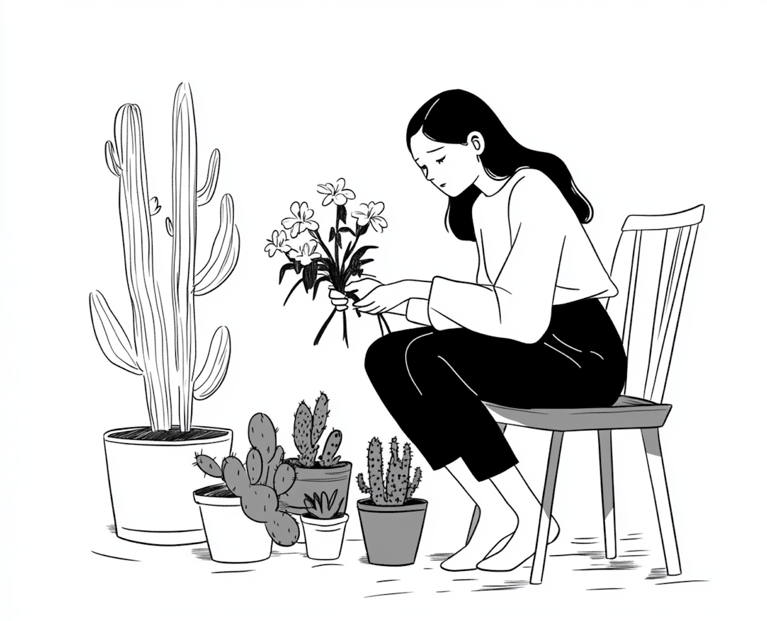 Black and white illustration of a woman tending to flowers, surrounded by potted cacti, conveying tranquility and nature care.