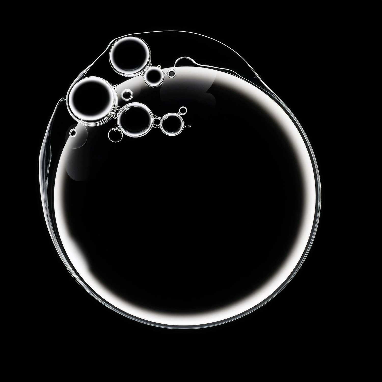 A close-up of a large bubble with smaller bubbles around it, set against a black background, highlighting their glossy and delicate forms.