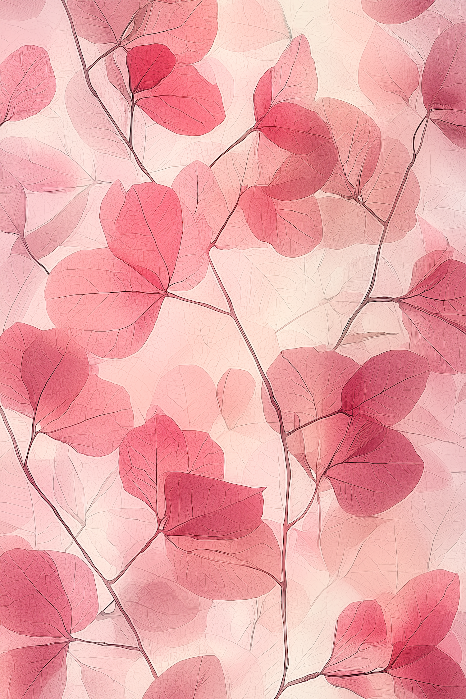 Elegant illustration of pink and red translucent leaves with intricate veins on a soft cream and pink gradient background.