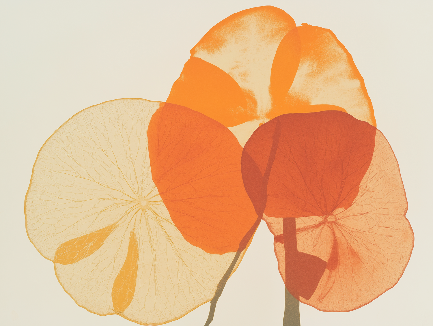 Vibrant translucent leaves in orange, red, and yellow overlap, creating a harmonious and artistic botanical composition.