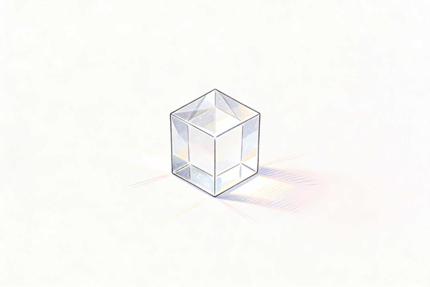 A minimalist illustration of a transparent cube with colorful refracted light shadows on a white background.