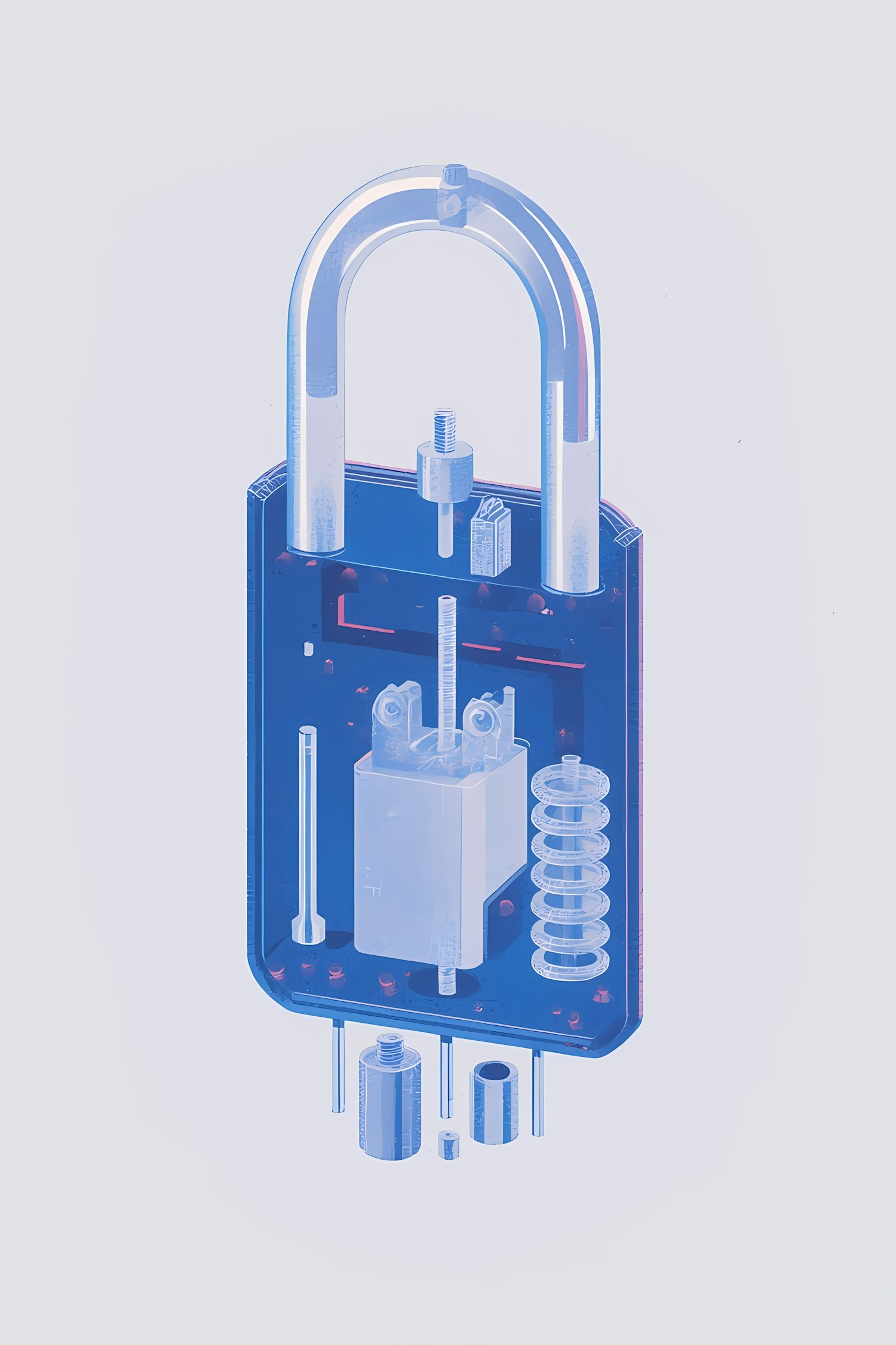Illustration of a padlock with exposed internal components, showcasing its mechanical design in a semi-transparent blue style.