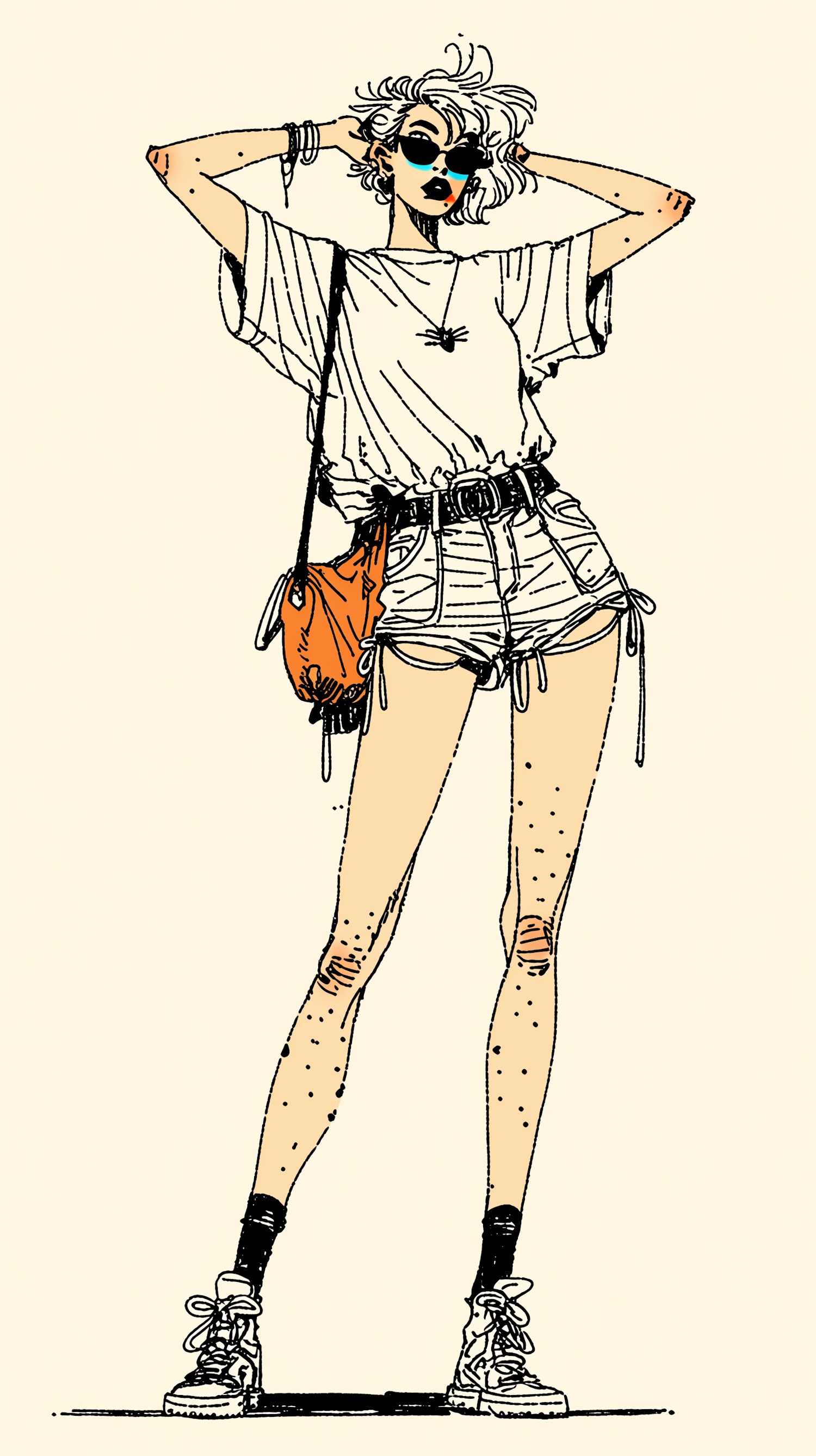 Stylized illustration of a trendy individual in casual summer attire, featuring a white t-shirt, denim shorts, and an orange bag.