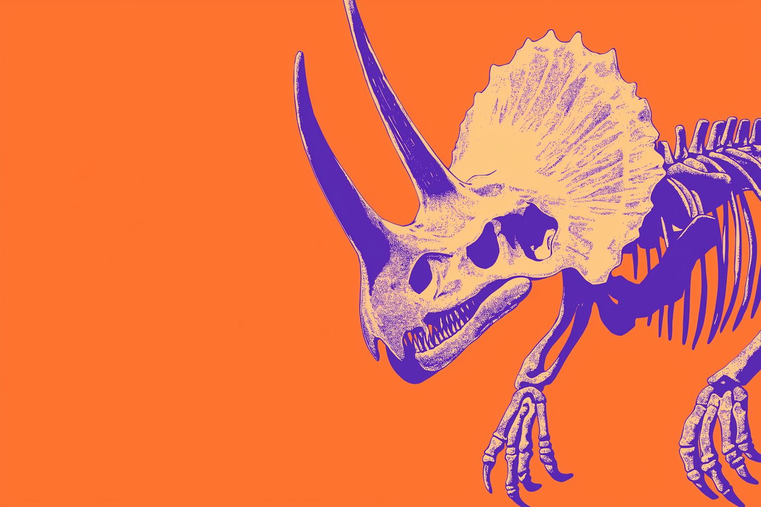 Bold triceratops skeleton illustration in purple and cream on a bright orange background, blending prehistoric charm with modern art.