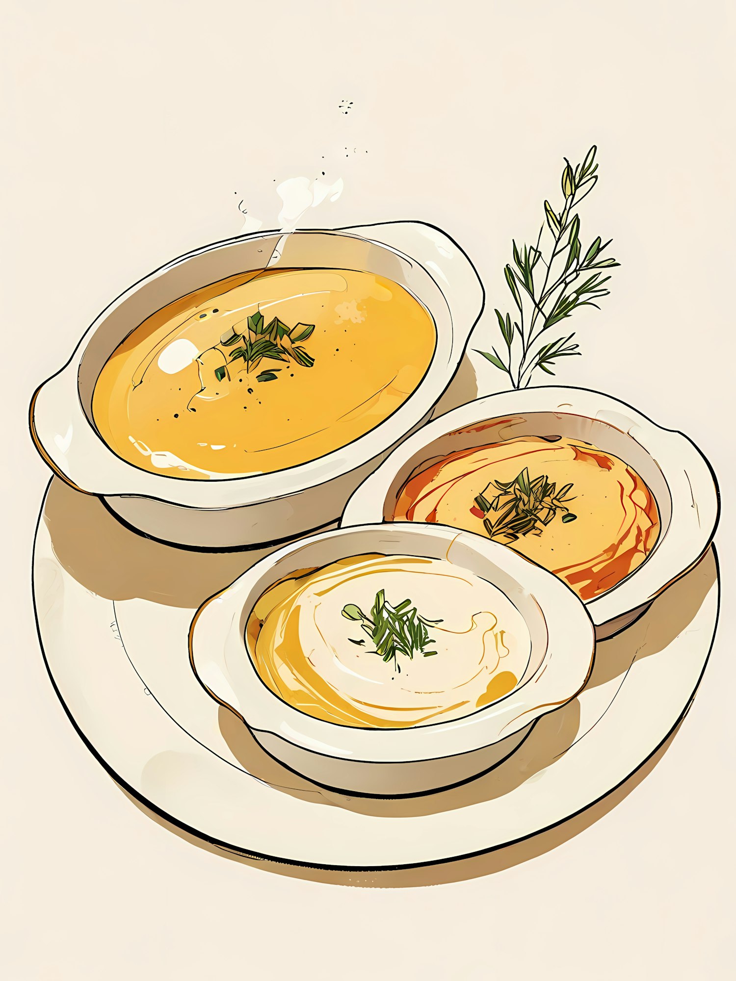 Illustration of three soups in bowls: yellow, white, and red-orange, garnished with herbs, on a white plate with a rosemary sprig.