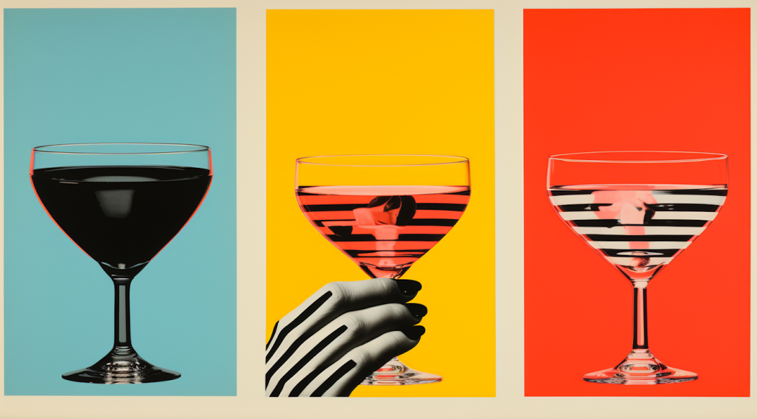 Pop-art triptych of cocktail glasses with bold colors and striped patterns, set against turquoise, yellow, and red backgrounds.