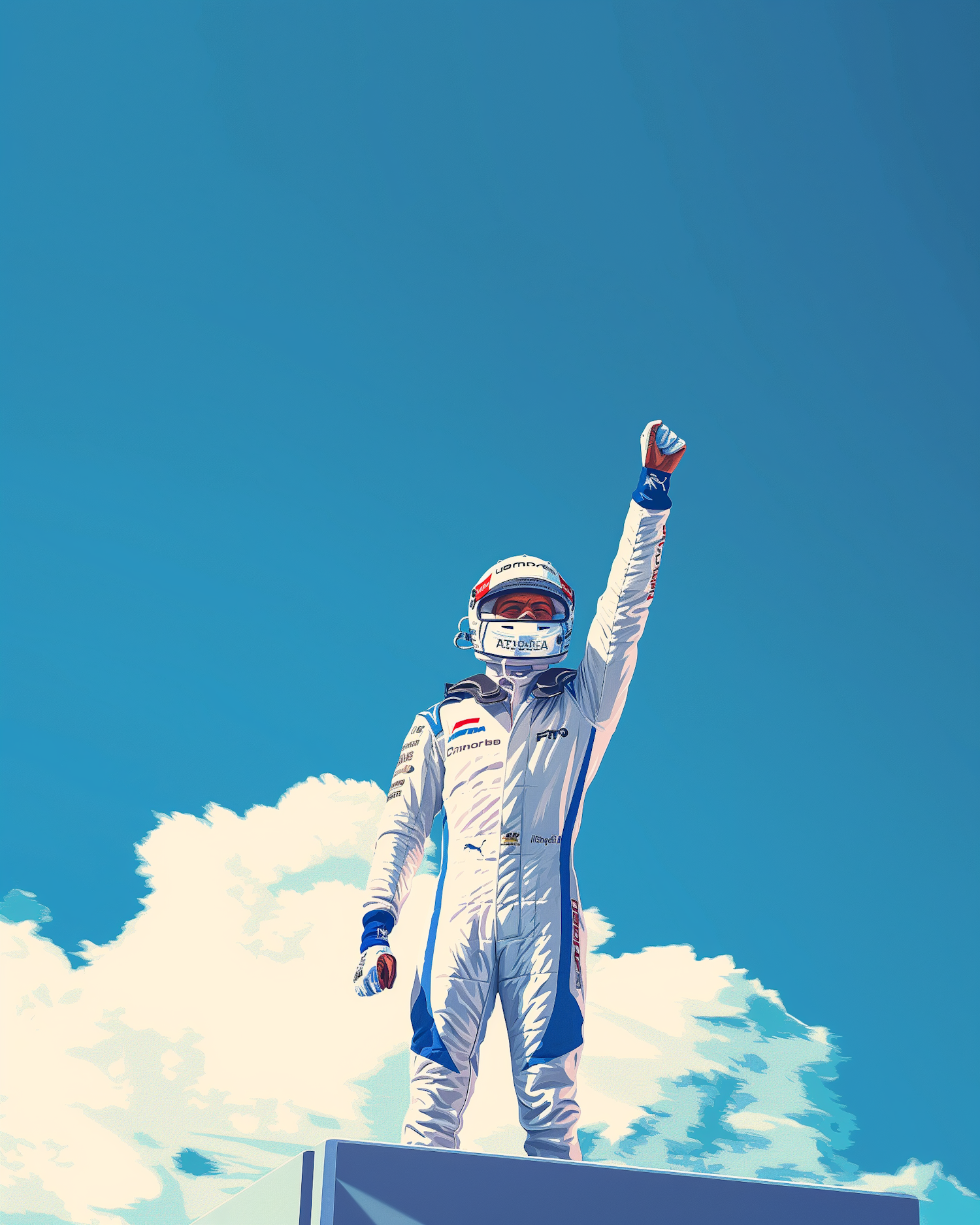 Race car driver celebrates victory on podium, wearing a white and blue suit against a vibrant blue sky with clouds.
