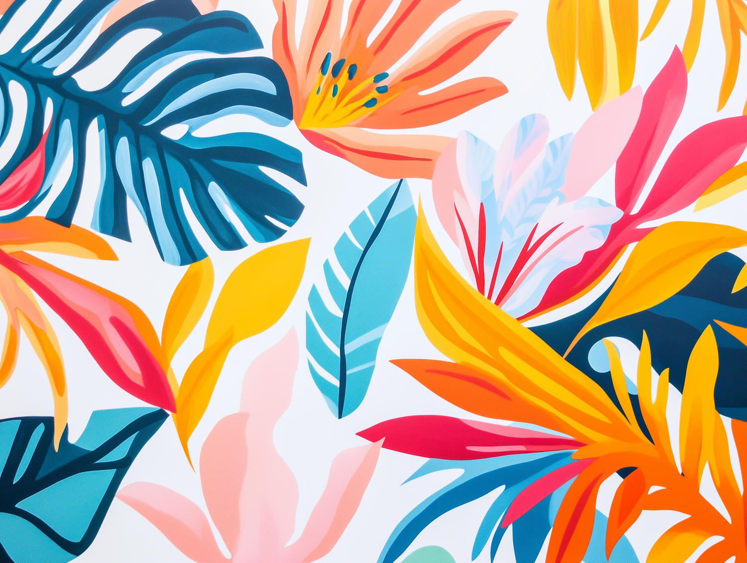 Bright tropical illustration with bold leaves and flowers in teal, orange, pink, and yellow on a clean white background.