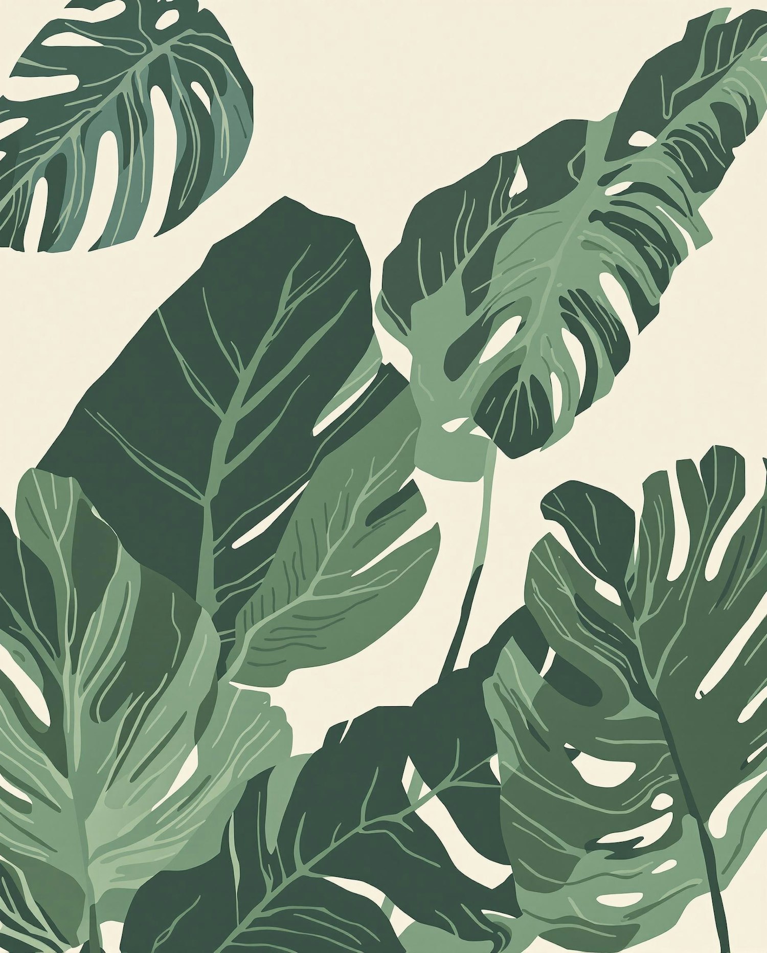 stylized tropical leaves, banana and monstera, dark green tones on light beige background, minimal shadow, clean graphic art