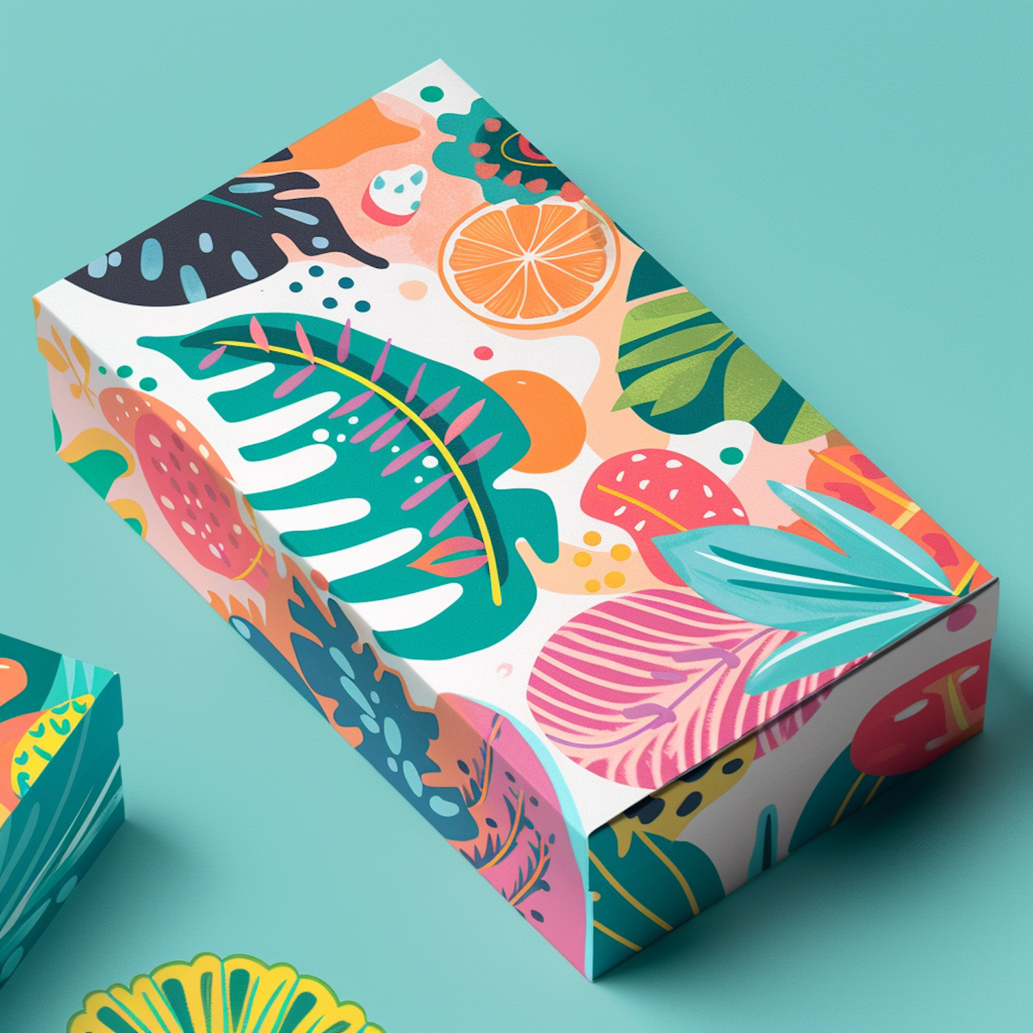 Colorful tropical-themed box with vibrant leaves and fruits on a teal background, perfect for gift packaging or decor.