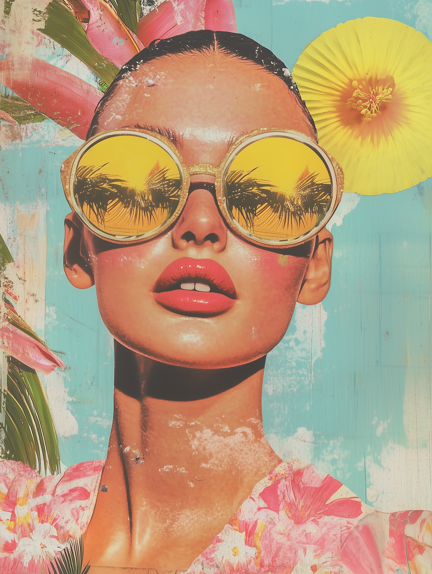 A colorful tropical-themed illustration of a woman with yellow sunglasses reflecting palm trees, set against a vibrant floral background.