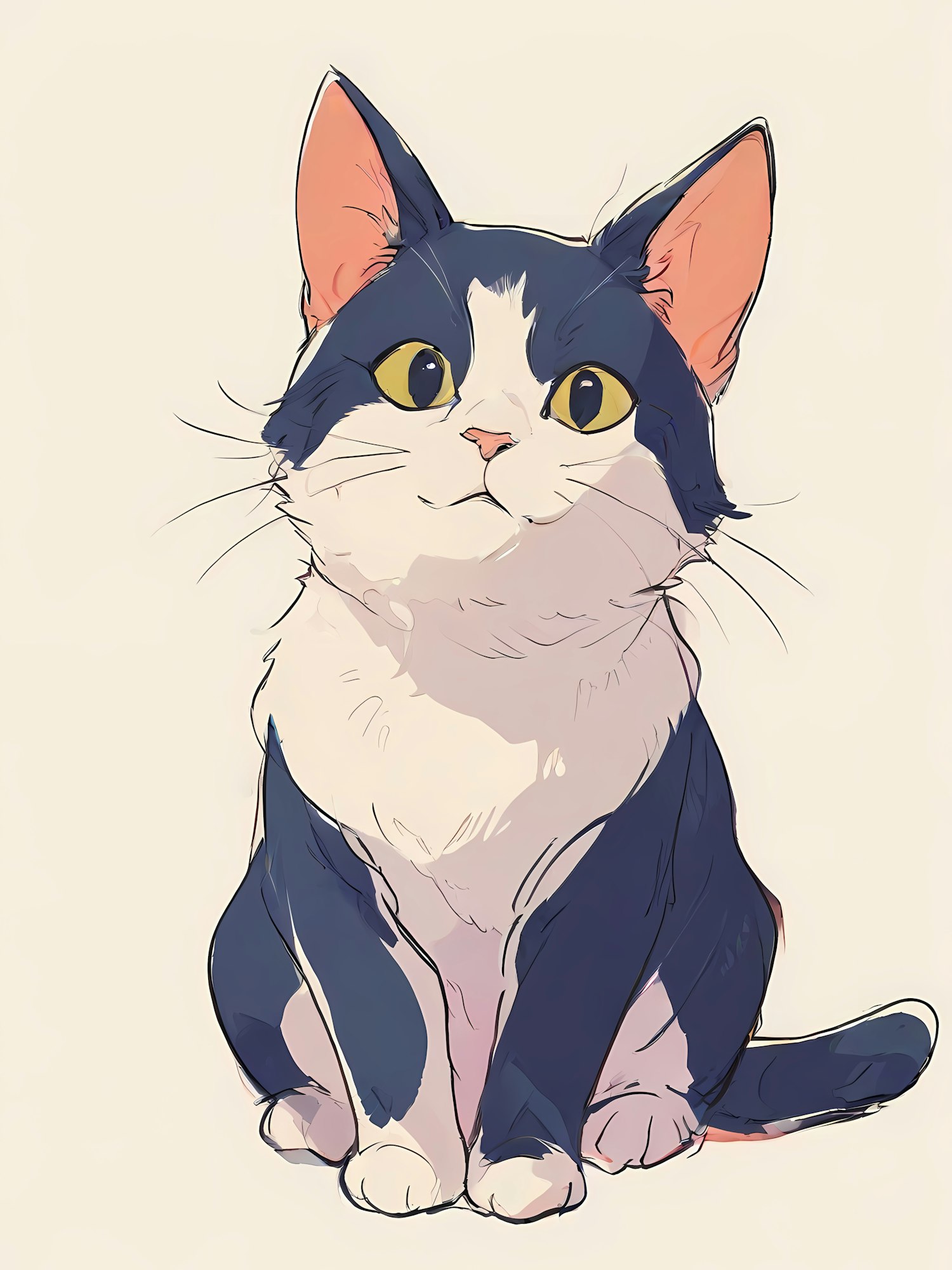 Adorable tuxedo cat illustration with yellow eyes and a curious expression, sitting calmly on a light beige background.