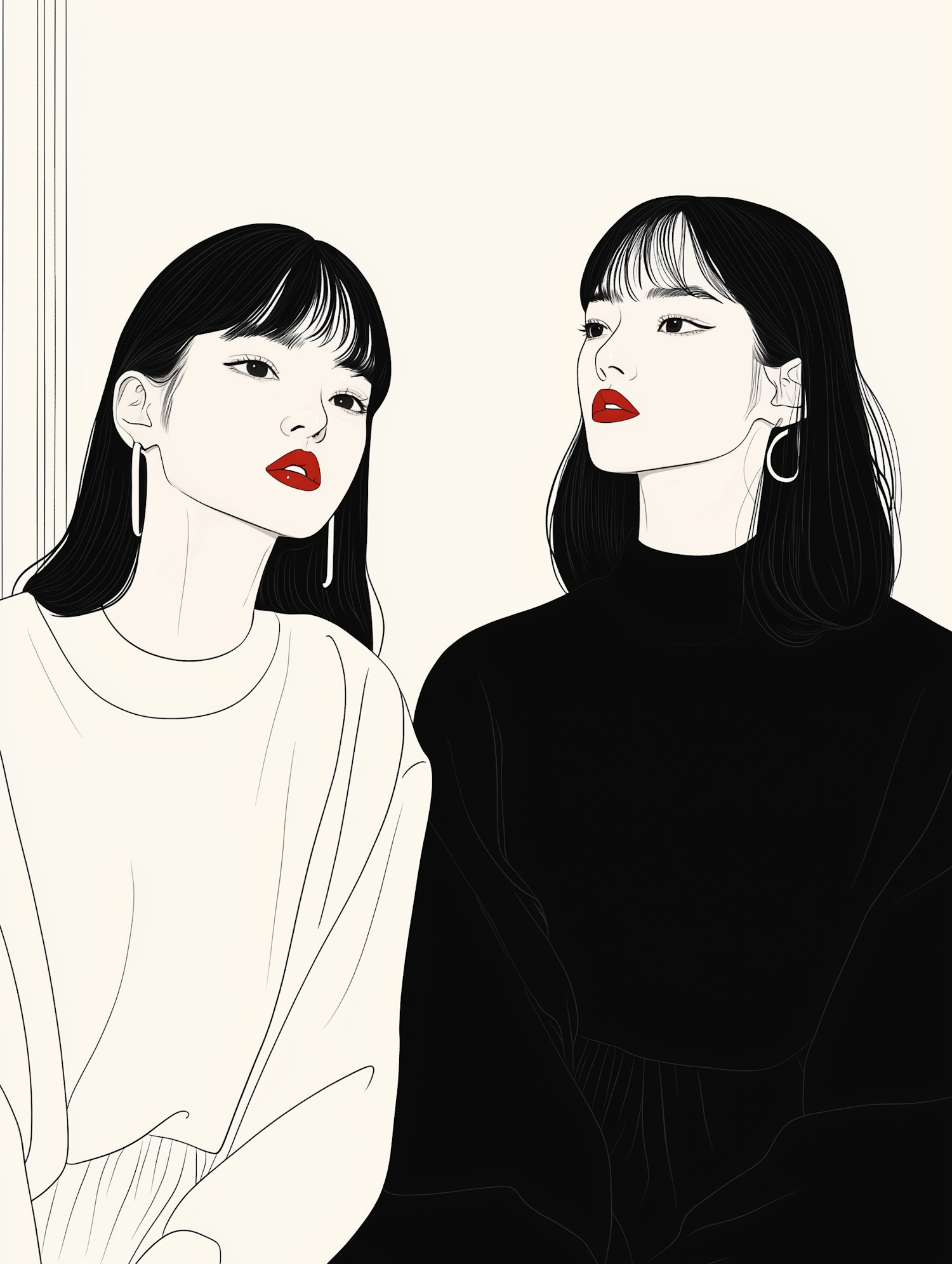 Minimalist illustration of two Asian women with black hair and red lips, wearing hoop earrings. One in a light sweater, the other in a dark top.