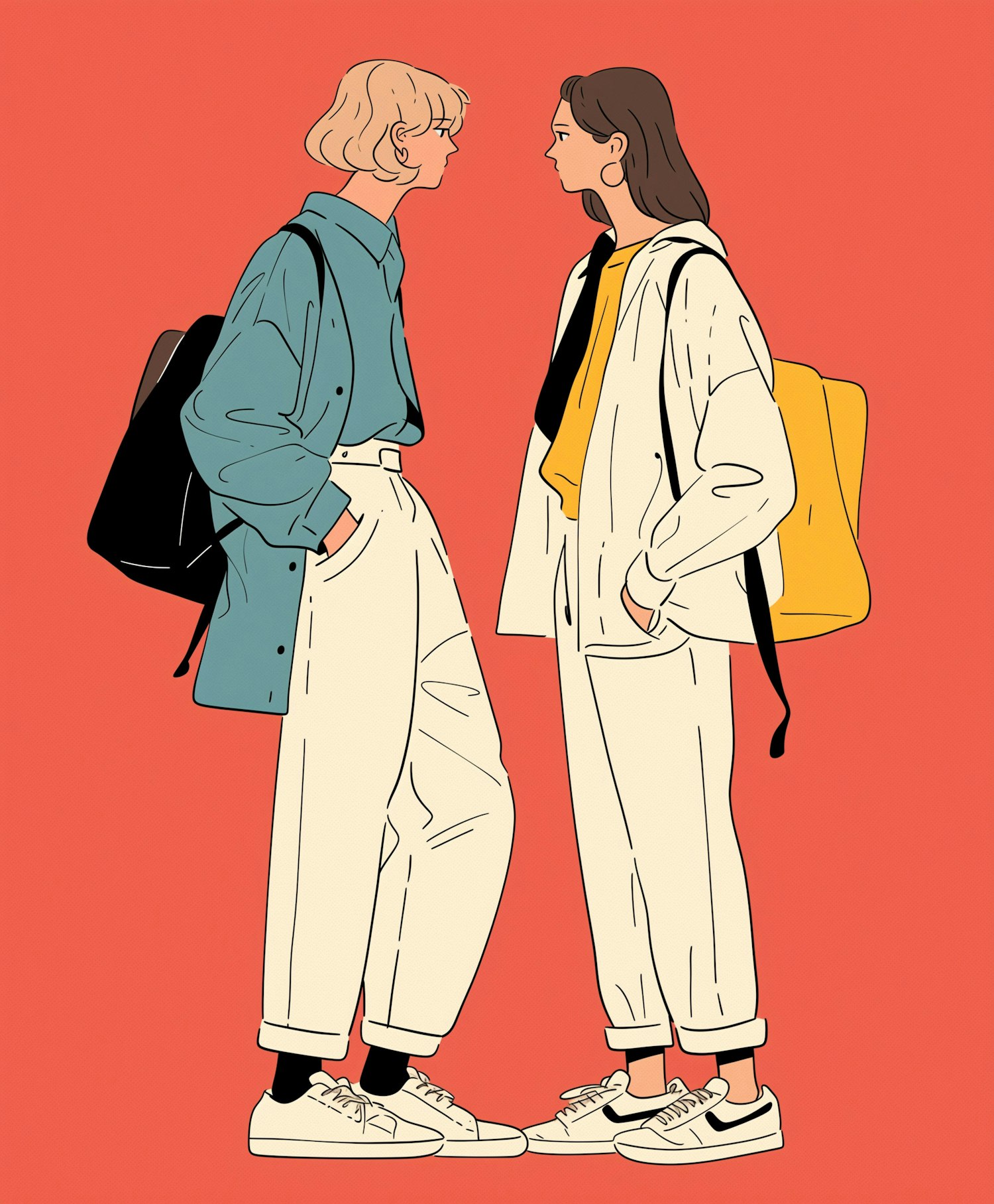 Two stylish women in casual outfits converse against a vibrant orange background, showcasing modern fashion with backpacks.