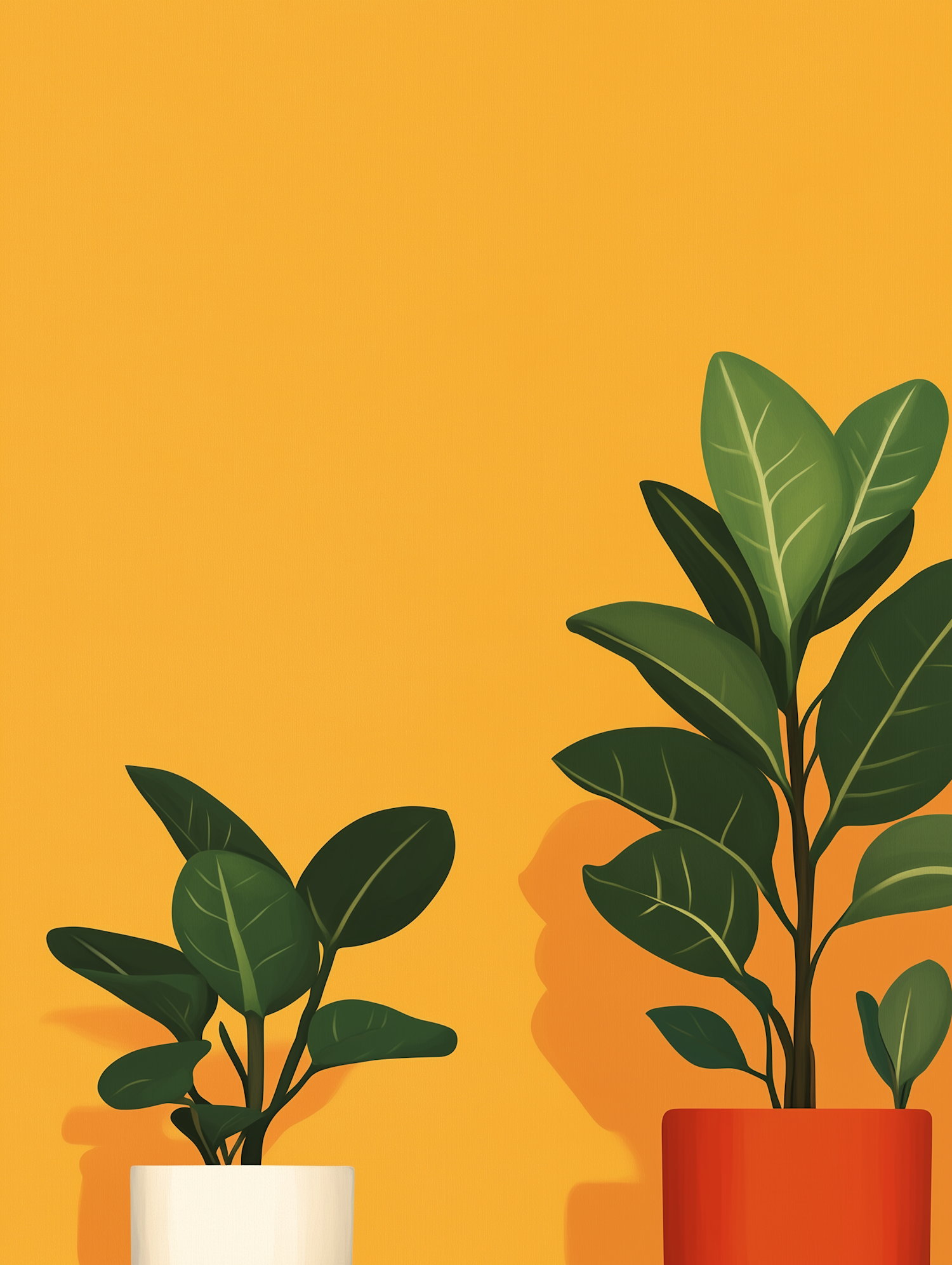 Two potted plants against a vibrant yellow background, one in a white pot and the other in a red pot, showcasing lush green leaves.