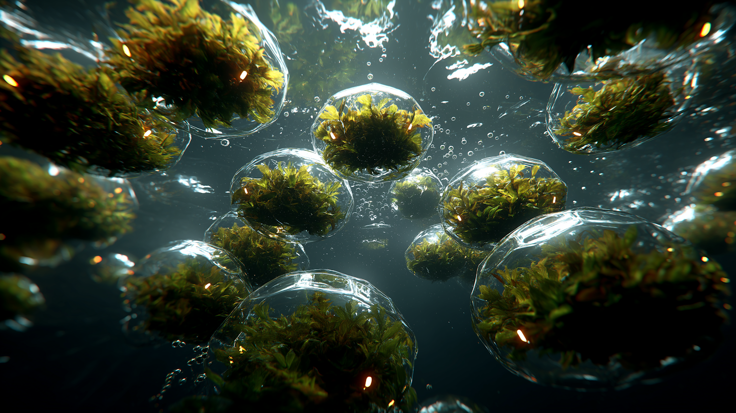 Surreal underwater scene with green vegetation encased in floating transparent spheres, surrounded by light and air bubbles.