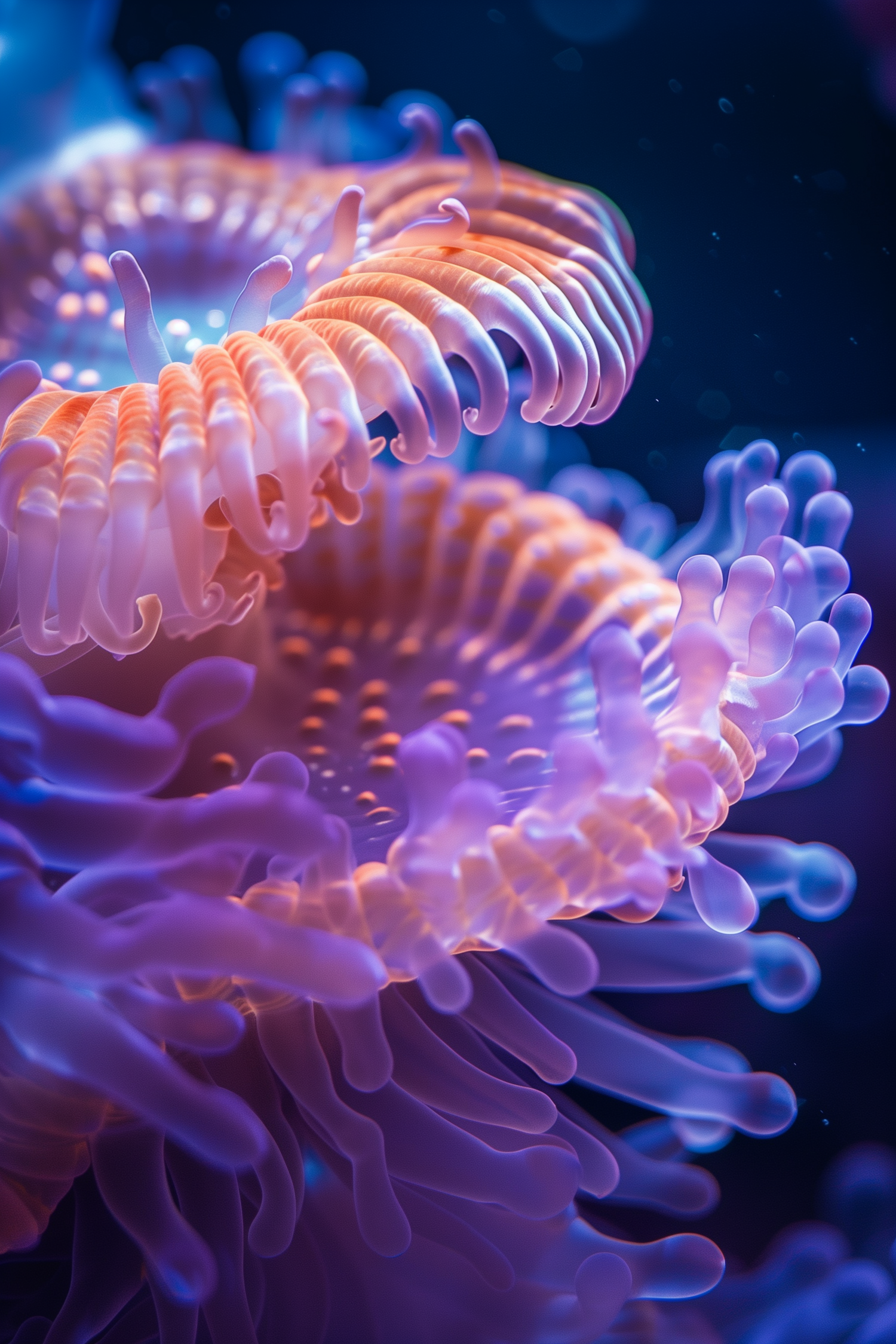 Vibrant close-up of sea anemones with glowing purple and orange tentacles against a deep blue background.