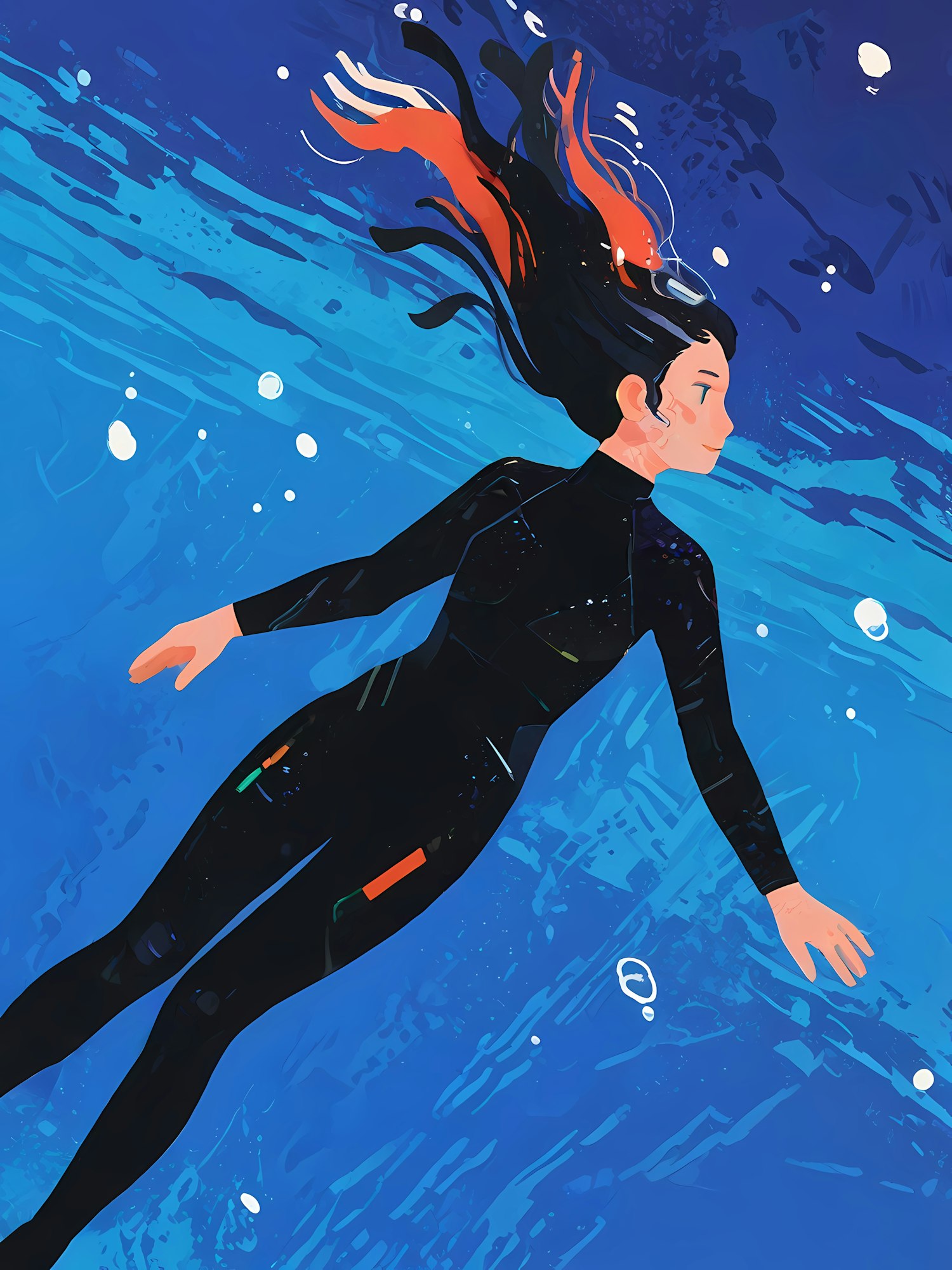 A serene underwater illustration of a woman in a black wetsuit with flowing hair, surrounded by vibrant blue water and bubbles.