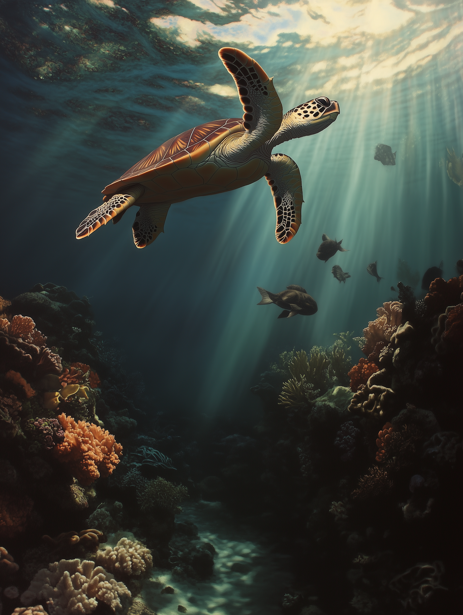 A sea turtle glides through sunlit waters above a vibrant coral reef, surrounded by colorful fish and marine life. A tranquil underwater scene.