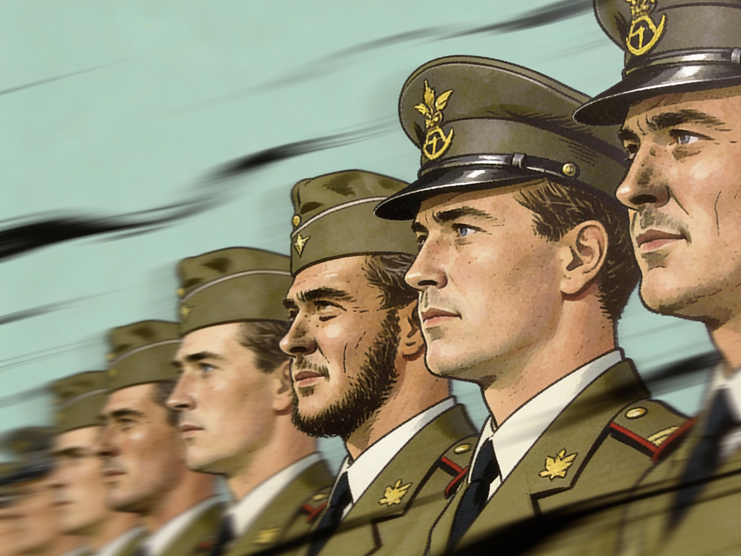 Stylized illustration of uniformed individuals in profile, showcasing unity and determination with detailed military-style attire.