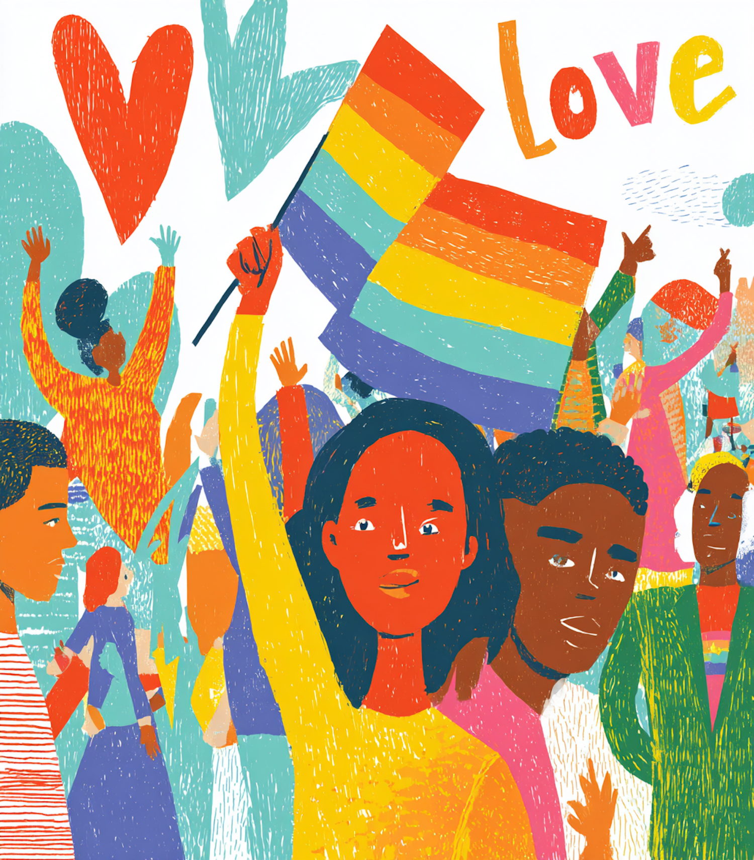A colorful illustration of diverse individuals celebrating LGBTQ+ pride, centered around a person holding a rainbow flag with 'Love' artwork.