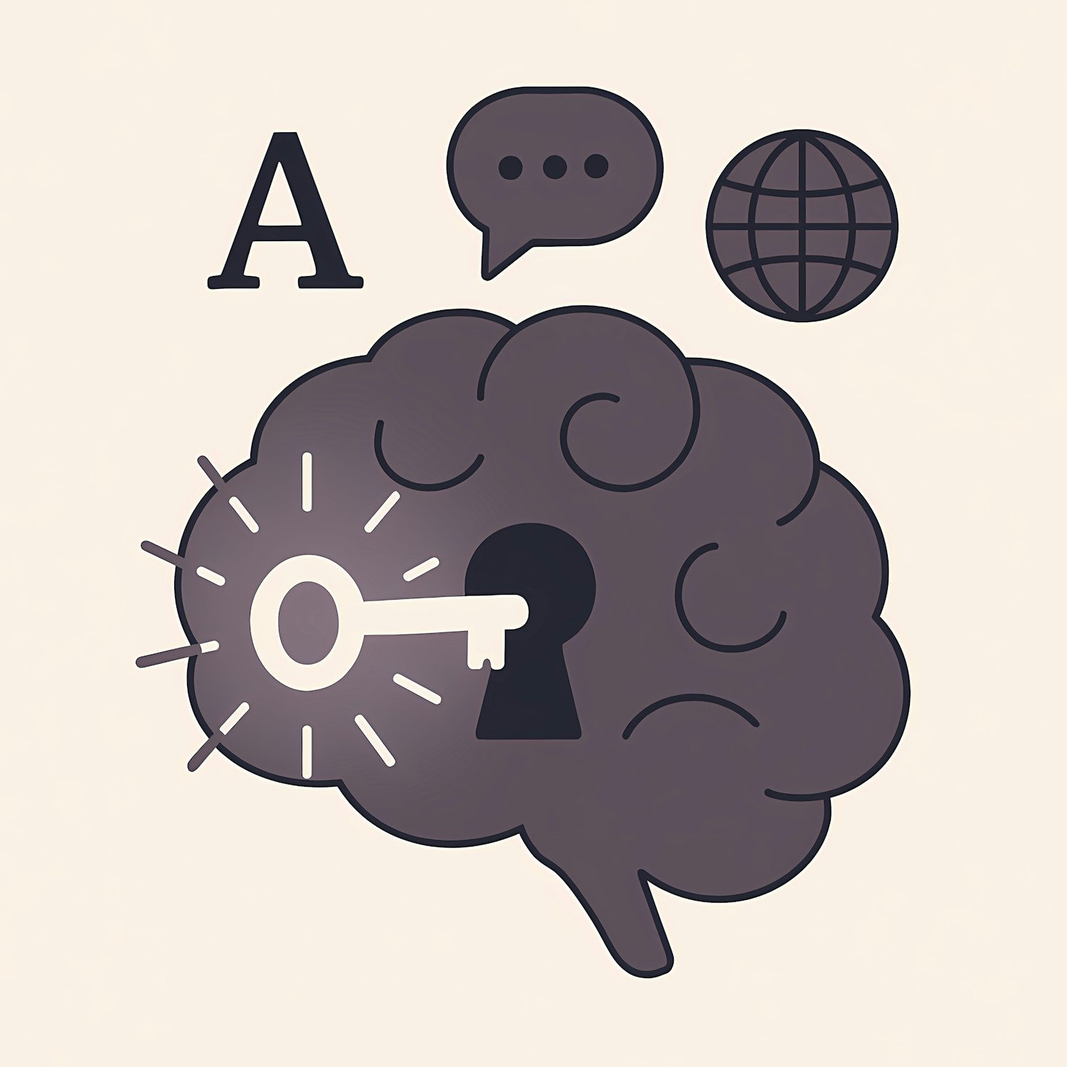 Illustration of a brain with a key unlocking it, surrounded by icons for language, communication, and global connectivity.