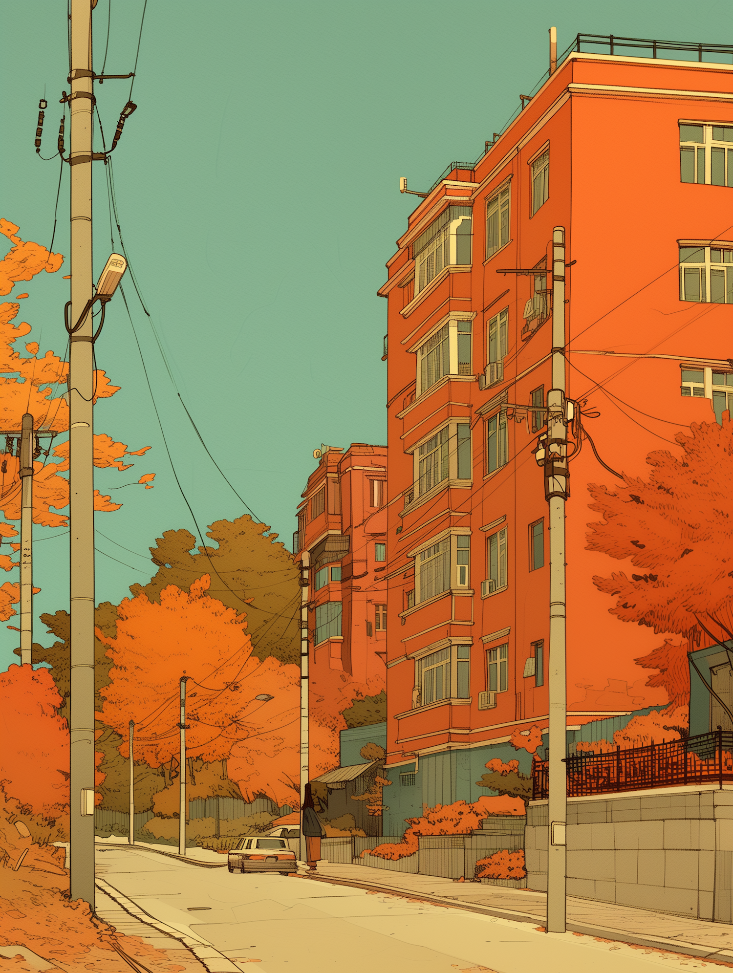 Illustration of an urban street in autumn with orange trees, a teal sky, and a vibrant orange apartment building.