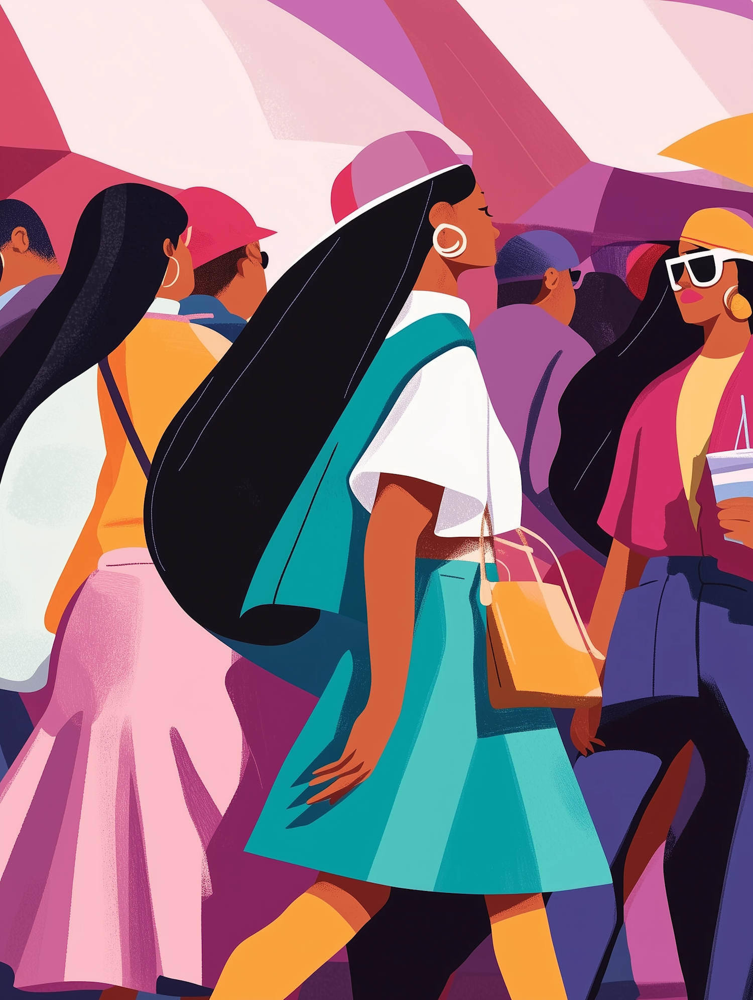 Colorful street scene illustration with diverse people, bold fashion, and vibrant colors like pink, teal, and yellow.