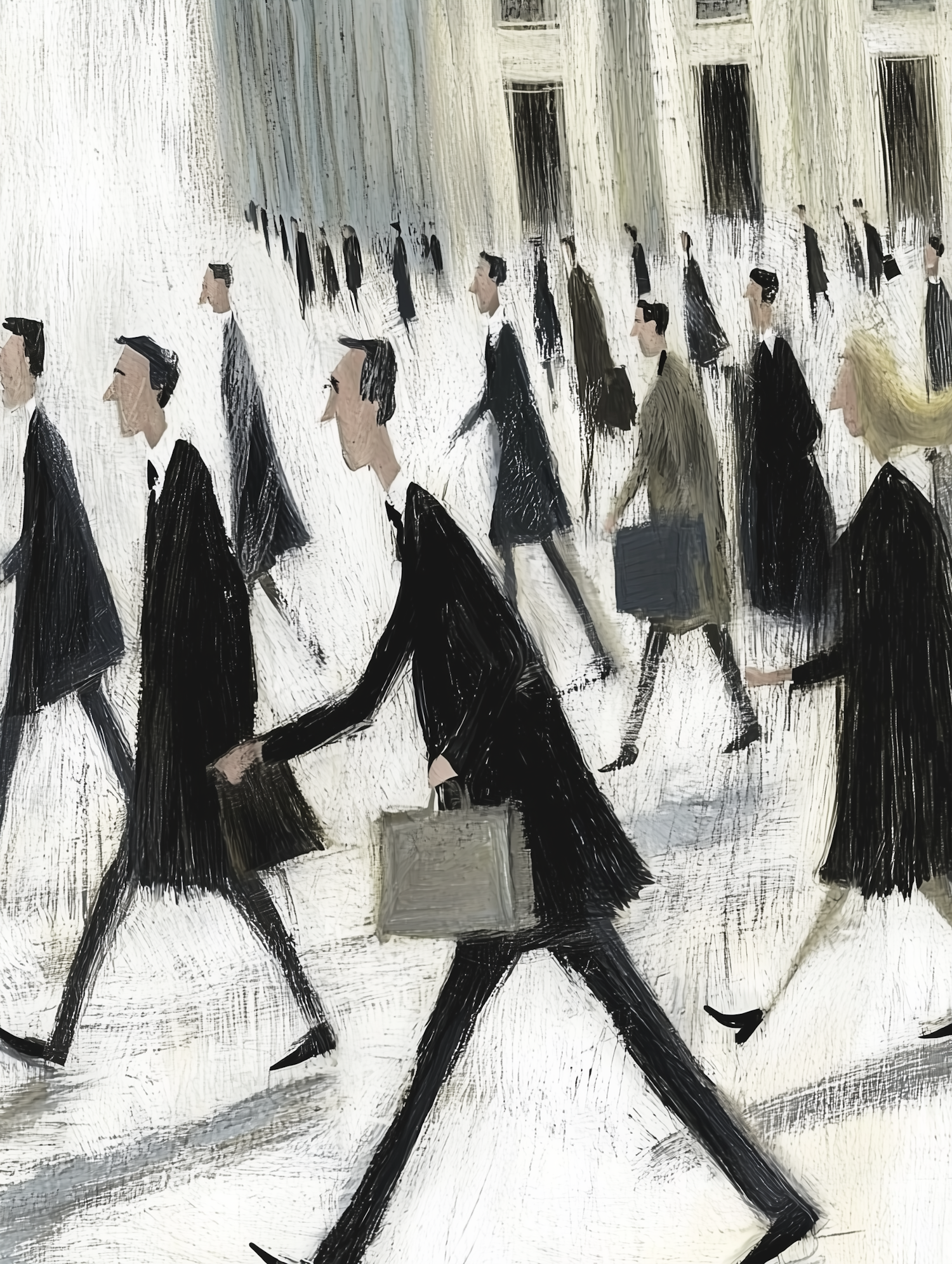 Stylized illustration of businesspeople walking in a cityscape, featuring textured brushstrokes and muted tones for a dynamic urban vibe.
