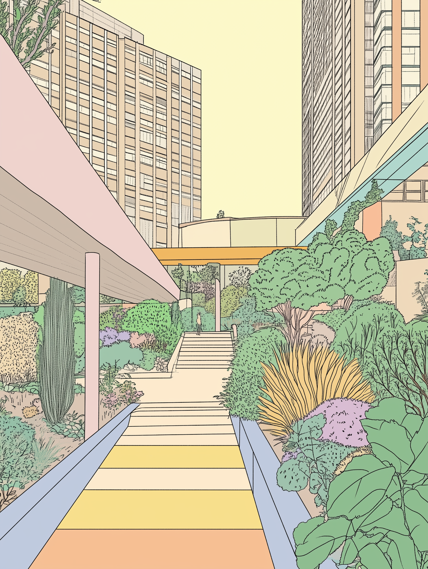 Pastel illustration of an urban garden with colorful pathways, lush greenery, and towering buildings under a soft yellow sky.