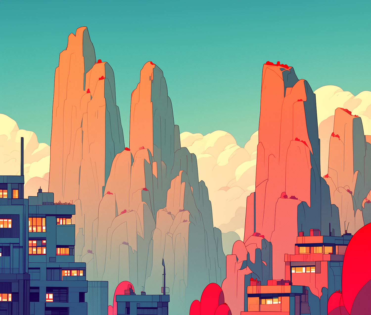 Futuristic cityscape with glowing buildings and towering stylized mountains under a vibrant sky.